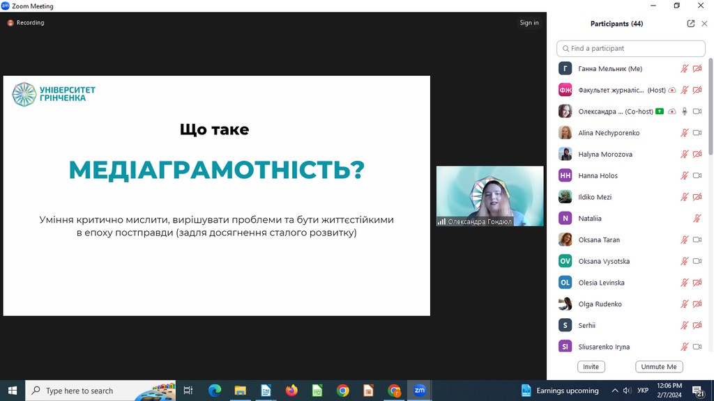 З 7 по 15 лютого 2024 року доценти кафедри міжнародних відносин Ганна Мельник та Ірина Слюсаренко в межах дидактичного модуля підвищення кваліфікації та діяльності «Медіахабу Університету Грінченка» прослухали курс за сертифікатною програмою «Медіаосвіта: європейські практики», який складався з 6 блоків і передбачав як теоретичну частину, так і практичну роботу науково-педагогічних працівників.