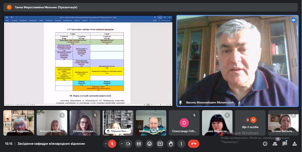 16 квітня 2024 р. відбулось засідання кафедри під час якого робочі групи представили зміни внесені в освітньо-професійні програми на основі, отриманих пропозицій протягом 2021-2023 рр., які надійшли шляхом анкетування та опитування стейкхолдерів. Науково-педагогічні працівники кафедри міжнародних відносин також висловили свої думки про вдосконалення освітньо-професійних програм.
