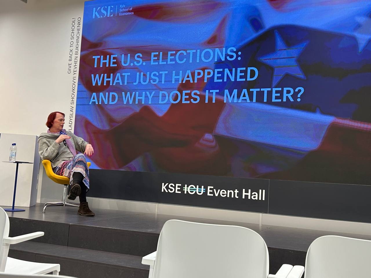 Під час зустрічі американські науковці з KSE, Афіна Смолл (Associate Professor) та Александра Вакру (VP for Strategic Engagement) проаналізували результати останніх виборів у США та їх вплив на політичну ситуацію як всередині країни, так і поза її межами. Особливу увагу було приділено питанню американсько-українських відносин.