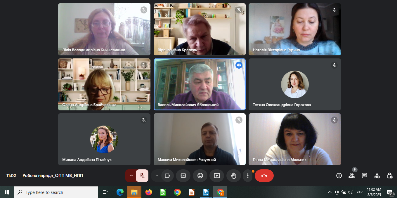 06 березня 2025 року відбулася відеозустріч членів робочої групи з розробки освітньо-професійної програми «Міжнародні відносини та дипломатія» другого (магістерського) рівня вищої освіти з представниками академічної спільноти. У зустрічі взяли участь Василь ЯБЛОНСЬКИЙ, доктор історичних наук, доцент, завідувач кафедри міжнародних відносин, Віра КРЕПЕЛЬ, кандидат філологічних наук, доцент, завідувач кафедри іноземних мов та науково-педагогічні працівники.