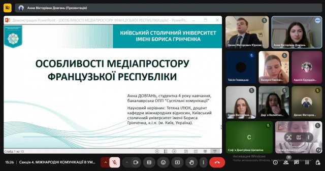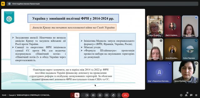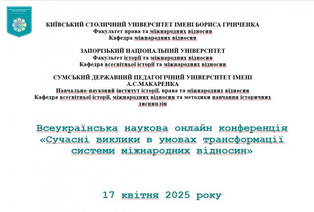 17 квітня 2025 р. на кафедрі міжнародних відносин Факультету права та міжнародних відносин Київського столичного університету імені Бориса Грінченка відбулася Всеукраїнська наукова онлайн конференція «Сучасні виклики в умовах трансформації системи міжнародних відносин». Співорганізаторами конференції виступили профільні кафедри Запорізького національного університету та Сумського державного педагогічного університету імені А.С. Макаренка.