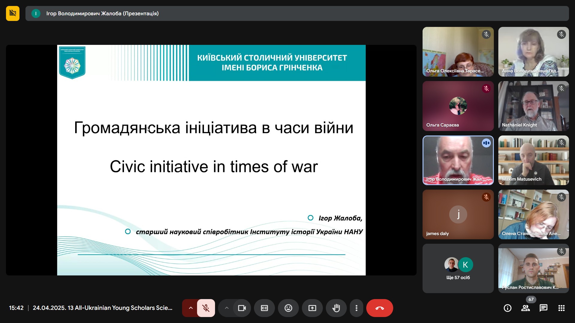 Під час пленарного засідання з доповіддю «Громадянська ініціатива в часи війни» виступив Ігор Жалоба, професор кафедри міжнародних відносин, доктор історичних наук, старший науковий співробітник Інституту історії України НАНУ. Під час свого виступу Ігор Володимирович здійснив ретроспективний аналіз настроїв, що панували в українському суспільстві напередодні повномасштабного вторгнення росії в Україну, акцентуючи увагу на здатності нашого народу самоорганізуватися у важких умовах, та поділився особистим досвідом боротьби з агресором в лавах Збройних сил України.