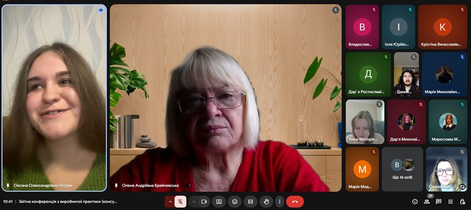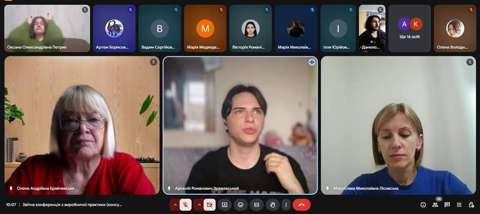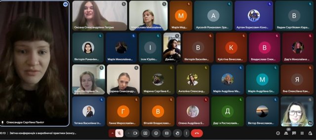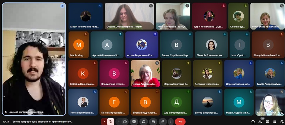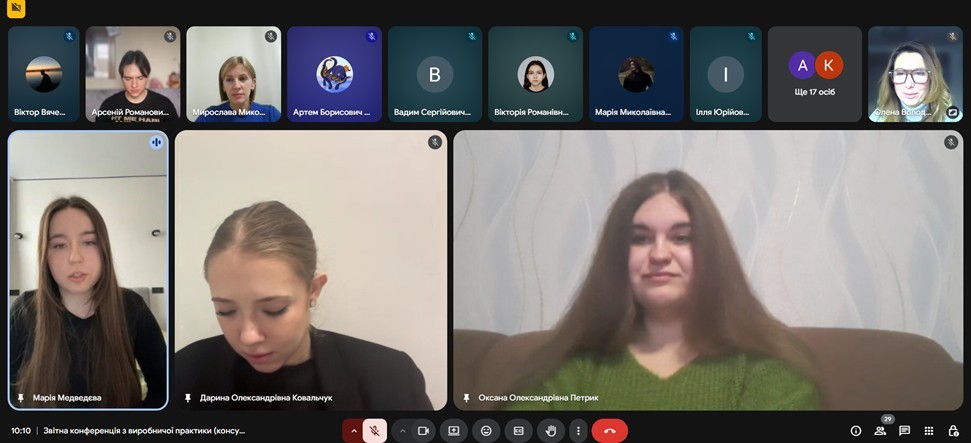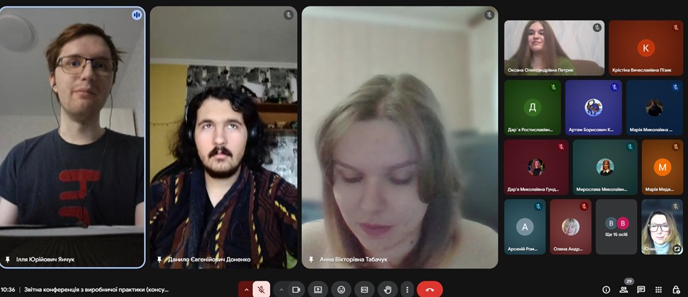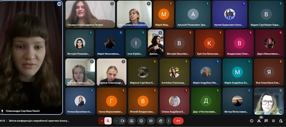 Завершення виробничої практики «Консульська робота» відбулося у форматі звітної конференції, на якій студенти доповіли про форми роботи та завдання, які вони виконували під час практики; підрозділи, в яких вони працювали; форми та специфіку роботи з документами.