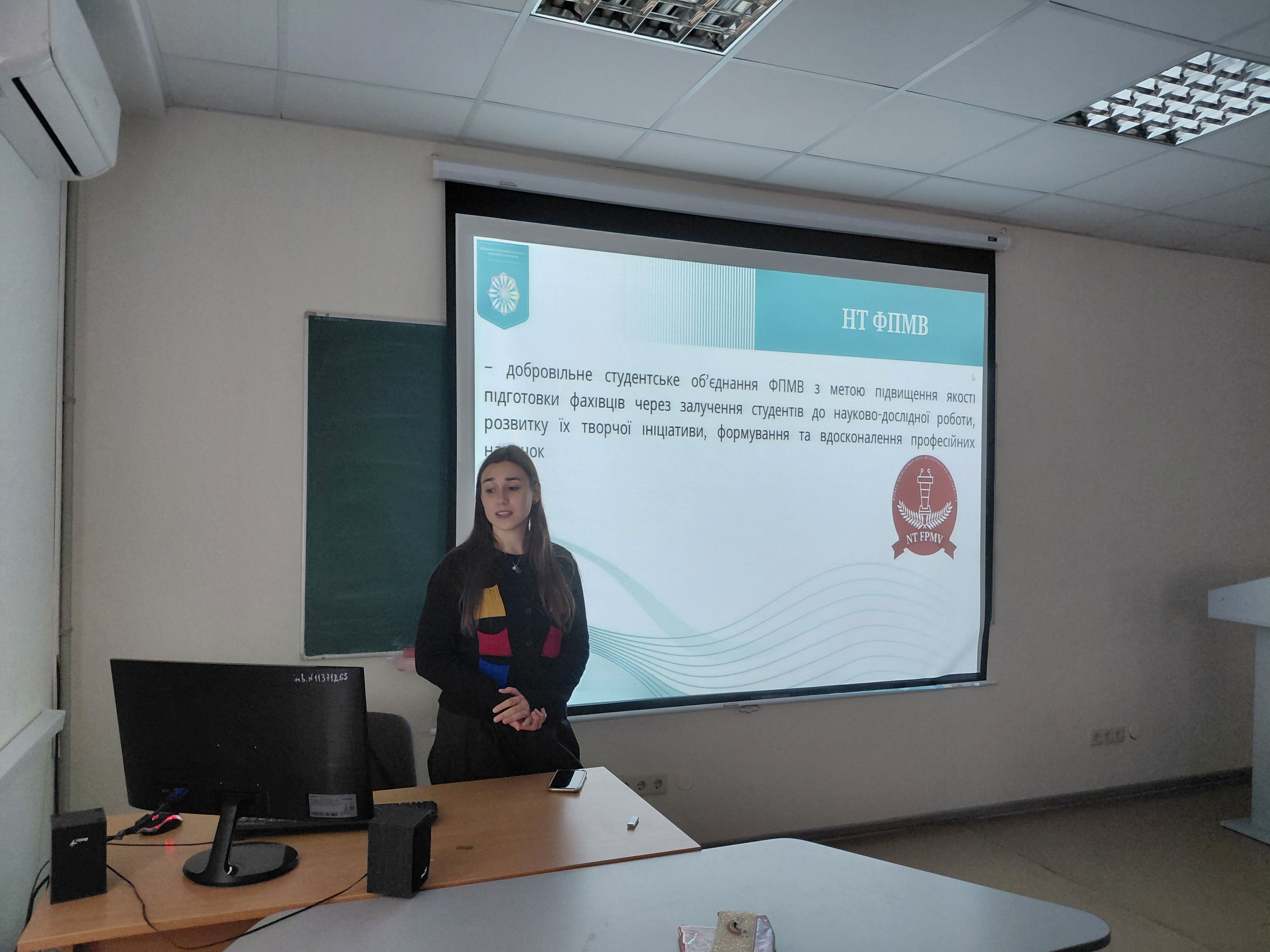 У невимушеній та дружній атмосфері вона розповіла про свій шлях у Науковому товаристві факультету, де в різні роки обіймала посади секретаря та заступниці голови. Студенти дізналися про ключові напрями роботи НТ, основні активності попередніх років, про участь у наукових заходах, студентських конференціях, освітніх ініціативах та проєктах, спрямованих на розвиток академічної культури та дослідницьких навичок.
