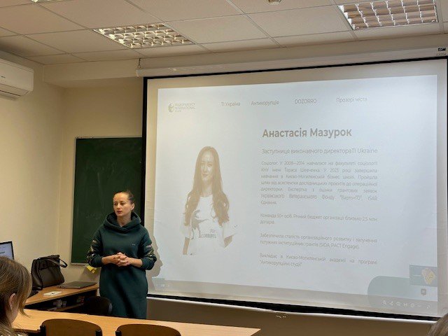 11 грудня 2025 р. на запрошення доцента кафедри міжнародних відносин Мирослави Лісовської заступниця виконавчого директора ГО «Transparency International Ukraine» Анастасія Мазурок провела інтерактивну зустріч зі здобувачами бакалаврських освітніх програм «Суспільні комунікації» та «Регіональні студії» 3-го року навчання.