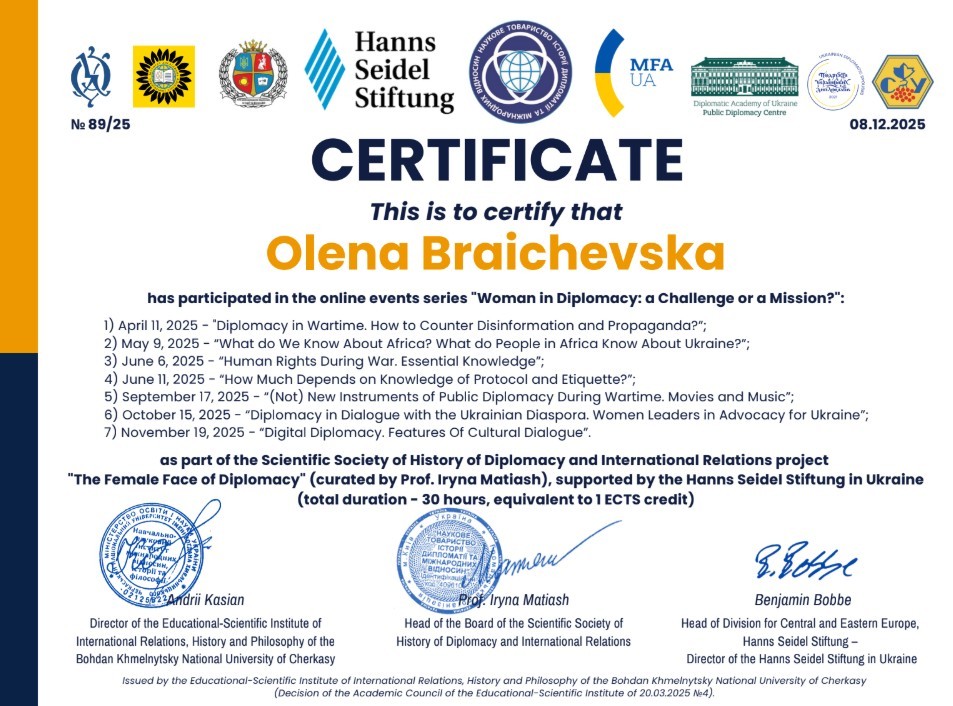 Кандидат історичних наук, доцент, доцент кафедри міжнародних відносин Олена Брайчевська і кандидат історичних наук, доцент, доцент кафедри міжнародних відносин Ганна Мельник пройшли підвищення кваліфікації під час навчальних онлайн заходів циклу «Жінка в дипломатії: виклик чи місія?», які проходили у межах реалізації проєкту Наукового товариства історії дипломатії та міжнародних відносин «Жіноче обличчя української дипломатії» (куратор –професор Ірина Матяш), що реалізується під патронатом Міністерства закордонних справ України, за підтримки Фонду Ганнса Зайделя у співпраці з Дипломатичною академією України імені Геннадія Удовенка при МЗС, Науково-дослідного центру «Інститут досліджень української діаспори імені професора Любомира Винара» Національного університету «Острозька академія», Асоціації «Подружжя українських дипломатів», Черкаського Національного університету імені Богдана Хмельницького, ВГО «Союз Українок».