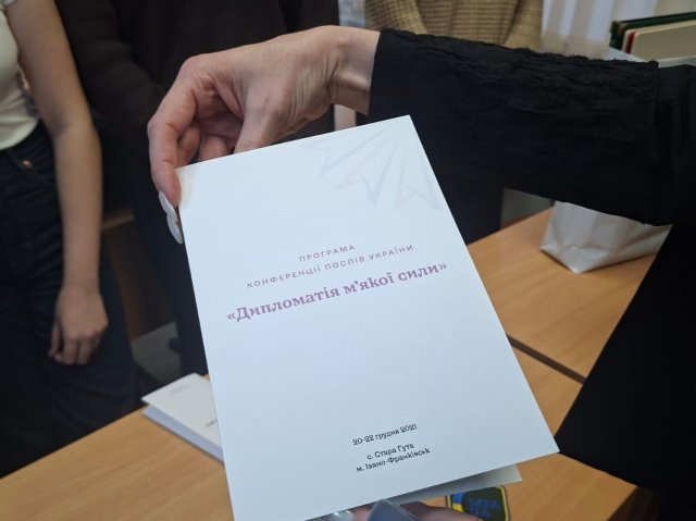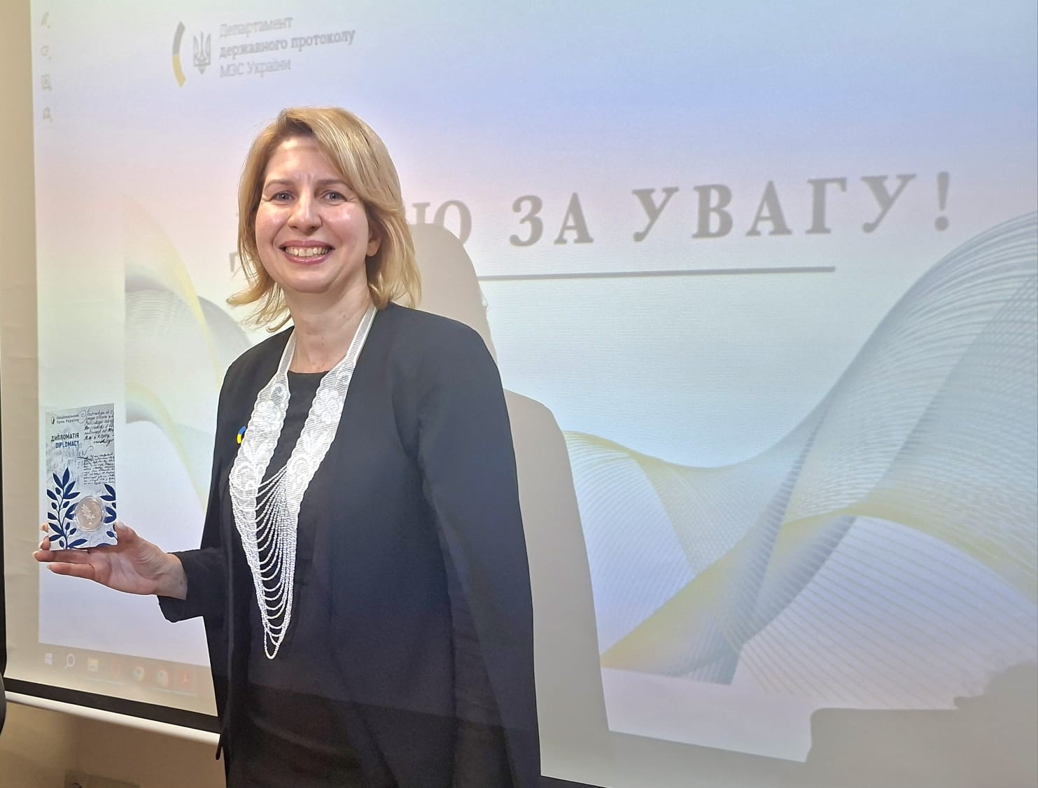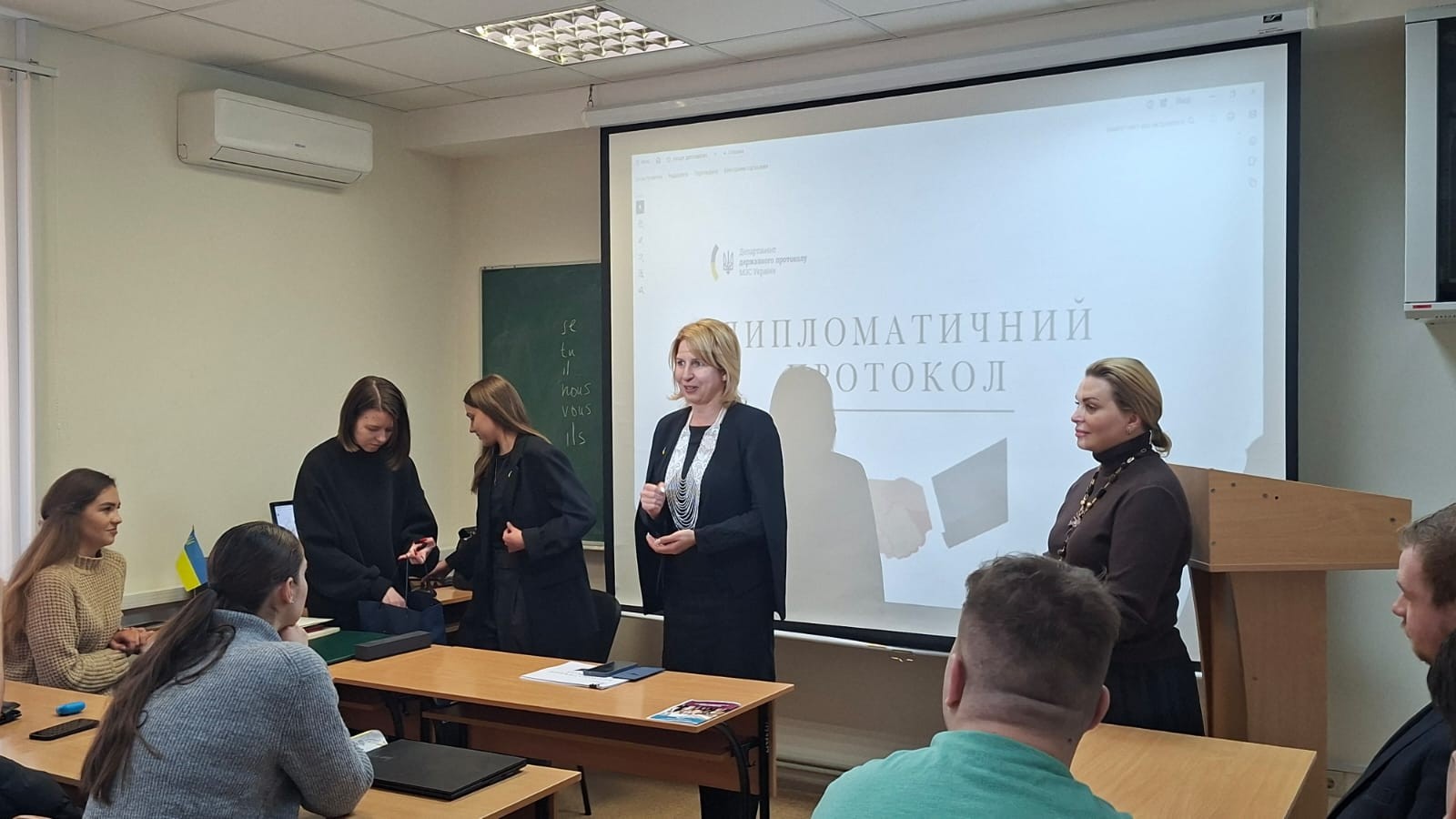 Гостьова лекція мала й практичну складову: здобувачі дізналися про практичні кейси підготовки офіційних візитів та дипломатичних документів, особливості дипломатичного етикету. Пані Директор наголосила на важливості дотримання вимог до дрес-коду та церемоніальних норм, що є першочерговим під час офіційних зустрічей та заходів, а також підкреслила значення толерантного підходу і врахування культурних особливостей гостей, що є важливим виміром сучасної публічної дипломатії. Чудовим візуальним доповненням до лекції стала демонстрація автентичної протокольної атрибутики, що використовується у дипломатичній практиці, яку наші гості люб’язно підготували для демонстрації. Студенти отримали можливість на власні очі побачити оригінали документів, зразки дипломатичної кореспонденції, офіційні атрибути, що постійно використовуються у сфері дипломатичних взаємин та приклади подарунків, які Україна готує для іноземних гостей.