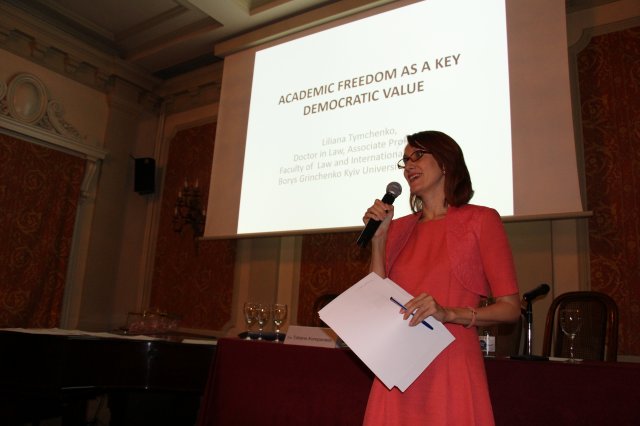 У рамках «Форуму людини» була запропонована для обговорення доповідь доктора права, кандидата юридичних наук, доцента кафедри міжнародних відносин та міжнародного права Факультету права та міжнародних відносин Київського університету імені Бориса Грінченка, Ліліани Тимченко, на тему: «Академічна свобода як основна демократична цінність». Дослідниця вказала на те, що академічна свобода є органічною частиною політичної свободи, гарантією реалізації громадянських прав і ключовою демократичною цінністю. Держава усвідомлює факт того, що при обмеженні академічної свободи, при здійсненні тотального контролю над наукою, свобода суспільства перестане існувати. Завдання науки — культивування моральних цінностей, в першу чергу таких, як свобода і справедливість.
