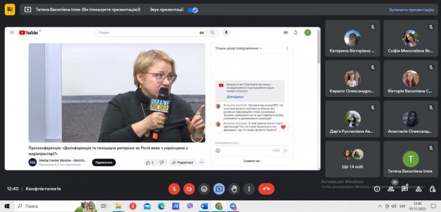 З величезним інтересом студенти дізналися про важливість термінологічної коректності, – не пропаганда, а «агресивна пропаганда» та «геноцидна риторика», – що дає можливість оцінювати їх дії з точки зору кримінальної відповідальності. Про сучасні тренди висвітлення війни російськими медіа: про сакралізацію війни, про порушення журналістських стандартів та пропаганду війни, про домінування тематики України в російському медіапросторі, коли Україні присвячено понад 40% усього національного медіапростору рф. Про наративи, які сьогодні домінують у медіапросторі.