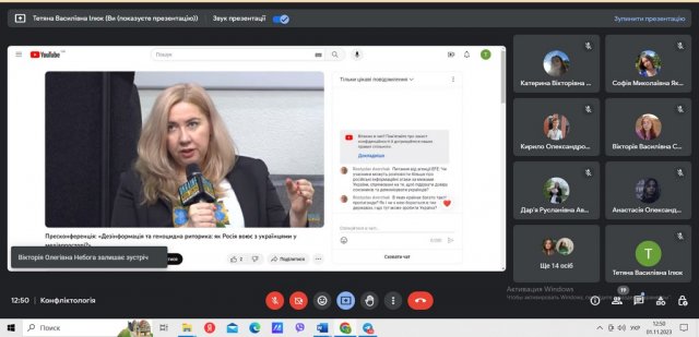 1 листопада 2023 року студенти 2-го курсу освітньої програми «Міжнародне право» долучилися до прес-конференції на тему “Дезінформація та геноцидна риторика: як Росія воює з українцями у медіапросторі?”, організованої Коаліцією “Україна. П’ята ранку” у партнерстві із Міністерством закордонних справ Нідерландів. Студенти відвідали захід в межах реалізації концепції практикоорієнтованого навчання, як практичне заняття із дисципліни «Конфліктологія» (викладач – доцент кафедри міжнародних відносин, кандидат історичних наук Тетяна Василівна Ілюк) в рамках діяльності Інформаційно-аналітичного центру компетентностей Факультету права та міжнародних відносин.