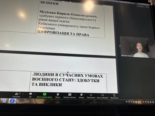 - Кирило Мусієнко, студент 2 року навчання спеціальності «Міжнародне право» КУБГ (Цифровізація та права людини в сучасних умовах воєнного стану: здобутки та виклики);