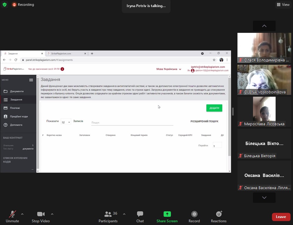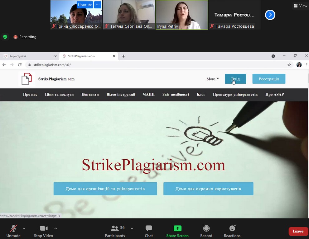04 листопада 2021 року викладачі кафедри міжнародних відносин та міжнародного права отримали можливість пройти онлайн-тренінг від представників компанії Strike Plagiarism, який був присвячений поглибленню цифрових компетентностей науково-педагогічних працівників, зокрема, під час перевірки студентських робіт на відповідність нормам академічної доброчесності.