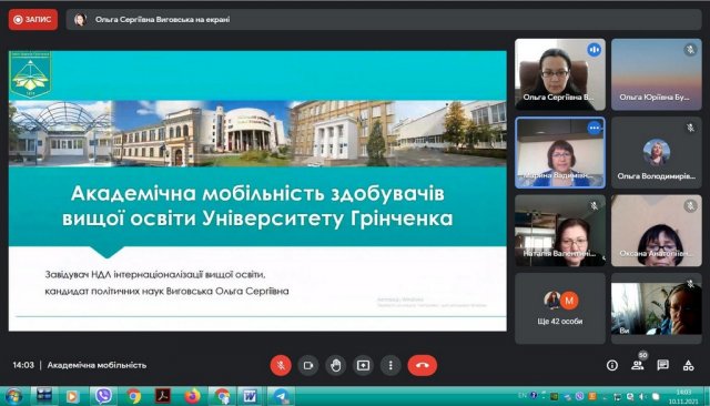 10 листопада 2021 року, в рамках інтернаціоналізації вищої освіти у Київському університеті імені Бориса Грінченка,, відбулася інформаційна он-лайн зустріч для кураторів та зацікавлених викладачів щодо можливостей міжнародної академічної мобільності. Зустріч була ініційована Ольгою Сергіївною Виговською, завідувачкою Науково-дослідної лабораторії інтернаціоналізації вищої освіти, кандидатом політичних наук, доцентом кафедри міжнародних відносин та міжнародного права.