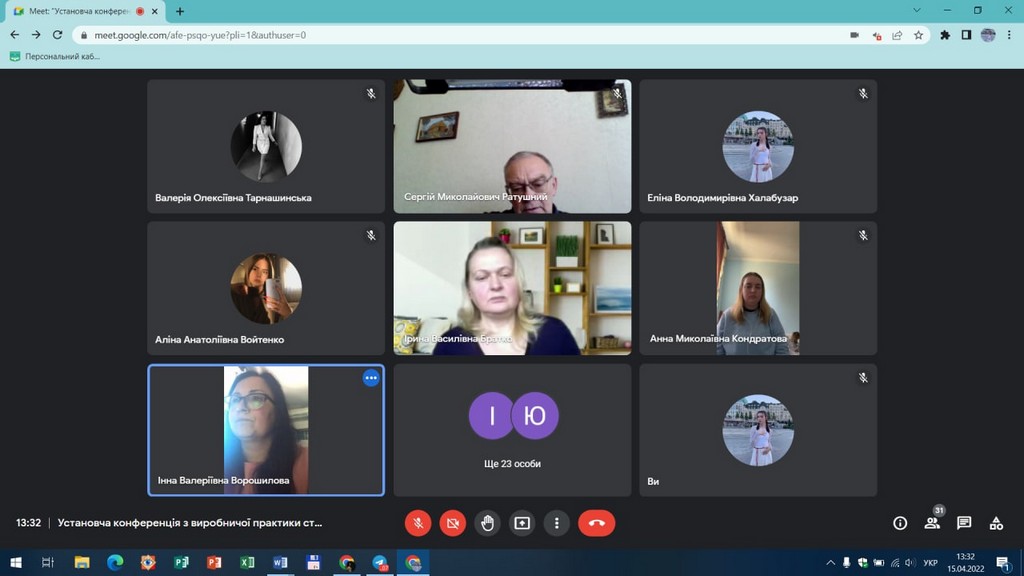 15 квітня 2022 р. відбулася установча конференція з виробничої практики (виконавчі та самоврядні органи) студентів ІІ курсу групи МПб-1-20-4.0д та виробничої практики (державні та самоврядні органи) студентів ІІІ курсу групи МПб-19-4.0д освітньої програми «Міжнародне право». Базами практики для майбутніх юристів-міжнародників стали Інститут законодавства Верховної Ради України (відділ європейського права та міжнародної інтеграції) (м. Київ), Юридична клініка «Астрея» Київського університету імені Бориса Грінченка (м. Київ), Адвокат Сергієнко Наталія Артурівна (м. Київ), ТОВ «Юридична компанія Хатнюк та партнери» (м. Київ), Освітня платформа «Legal High School» (м. Київ), Адвокатське бюро Олега Простибоженка (м. Київ), Сарненський районний відділ філії Державної установи «Центр пробації» у Рівненській області та ін. В умовах воєнного стану, запровадженого в Україні, практика проходитиме у дистанційному форматі. Студенти отримали всю необхідну інформацію згідно з програмами проходження виробничої практики. Організатором виробничої практики виступила доцент кафедри міжнародних відносин та міжнародного права, кандидат юридичних наук, старший науковий співробітник Інна Ворошилова.