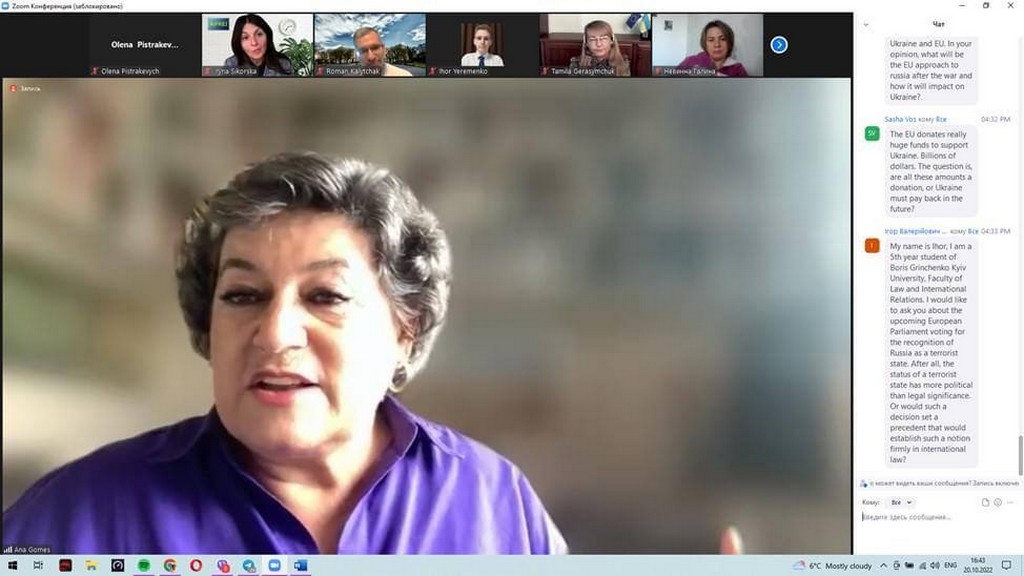 20 жовтня 2022 року студенти ОП «Міжнародне право» разом зі студентами бакалаврських та магістерських освітніх програм «Суспільні комунікації» та «Регіональні студії» мали можливість долучитися до онлайн-дискусії у форматі круглого столу на тему «Відносини Україна-ЄС: оновлення та вдосконалення» (EU-Ukrainian Relations: Updating and Upgrading), організованої представниками Української асоціації викладачів і дослідників європейської інтеграції та Львівського національного університету імені Івана Франка Іриною Сікорською та Романом Калитчаком.