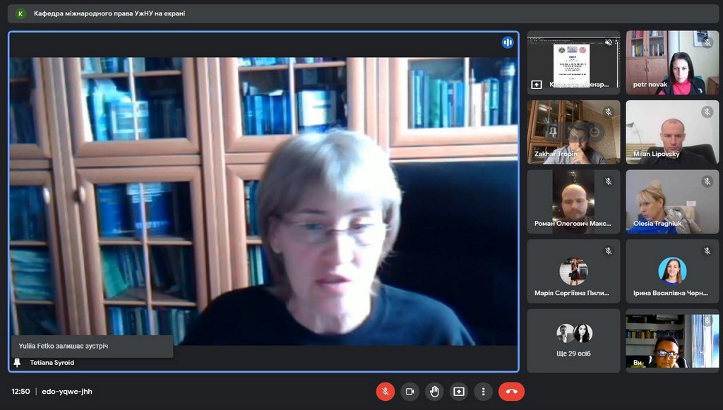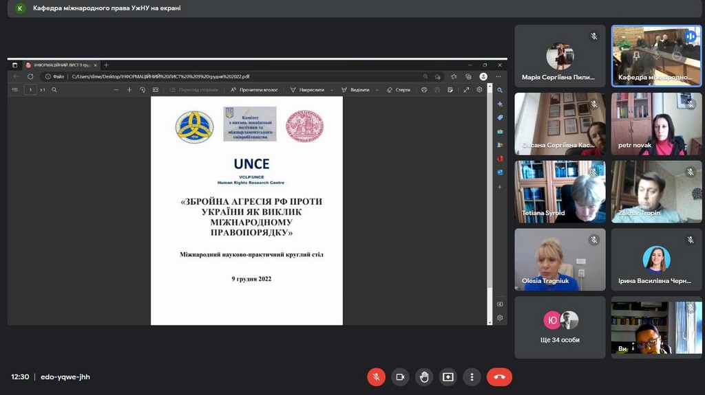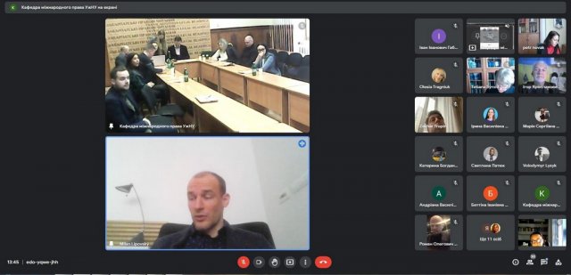 9 грудня 2022 року студенти 4 року навчання ОП «Міжнародне право» отримали можливість долучитися до роботи Міжнародного науково-практичного круглого столу «Збройна агресія РФ проти України як виклик міжнародному правопорядку». Це стало можливим завдяки кандидату юридичних наук, старшому науковому співробітнику, доценту кафедри Інні Ворошиловій та її колегам з кафедри міжнародного права Юридичного факультету Ужгородського національного університету. Участь у заході також взяла старший викладач кафедри Оксана Каспрук.