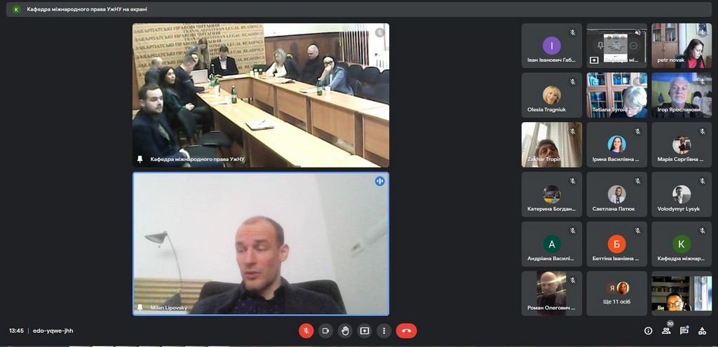 З вітальними словами до учасників заходу виступили заступник голови Комітету ВРУ, доктор юридичних наук, професор, академік НАН України, Заслужений юрист України Олександр Копиленко, декан Юридичного факультету УжНУ, доктор юридичних наук Ярослав Лазур та старший викладач кафедри міжнародного права юридичного факультету Карлового університету, експерт Центру з прав людини UNCE Алла Тимофеєва.