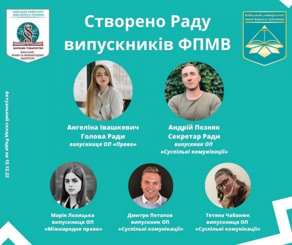 На Факультеті права та міжнародних відносин створено Раду випускників, до складу якої увійшли одні з найкращих студентів Факультету. Днями відбулося перше засідання випускників Факультету права та міжнародних відносин Київського університету імені Бориса Грінченка, на якому було затверджено склад Ради випускників та План дій на 2023 календарний рік.