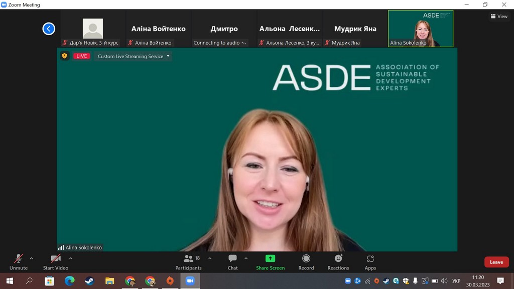 30 березня 2023 року студенти 3 курсу спеціальності «Міжнародне право» разом з іншими студентами Факультету права та міжнародних відносин відвідали вебінар на тему “Соціальний менеджмент державного та приватного сектору: трансформація під час війни” в рамках проєкту Sustainability Recovery Guidance – серії вебінарів, що впроваджені з метою формування платформи взаємодії бізнесу, експертів та інвесторів у сфері сталого розвитку. Спікерами виступили Севгіль Мусаєва – головна редакторка онлайн-видання «Українська правда», В’ячеслав Лисенко – акціонер Meest China, експерт з українсько-китайських відносин, Марія Мезенцева – голова Постійної делегації України у Парламентській Асамблеї Ради Європи, а також Сергій Гайдайчук – президент Ceo Club Ukraine, співзасновник Young Business Club. Модерацію заходу здійснювала голова Асоціації експертів зі сталого розвитку Аліна Соколенко.
