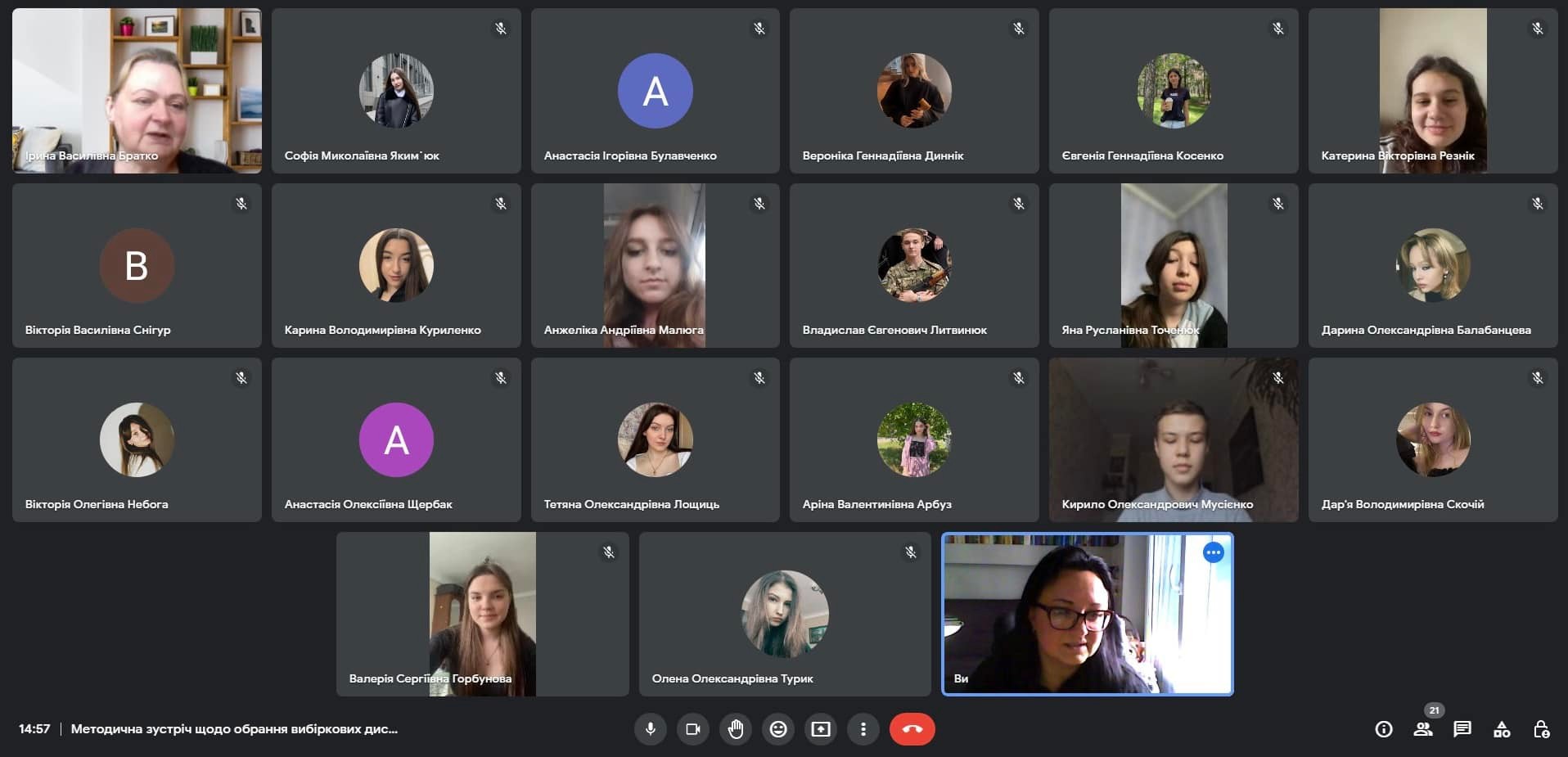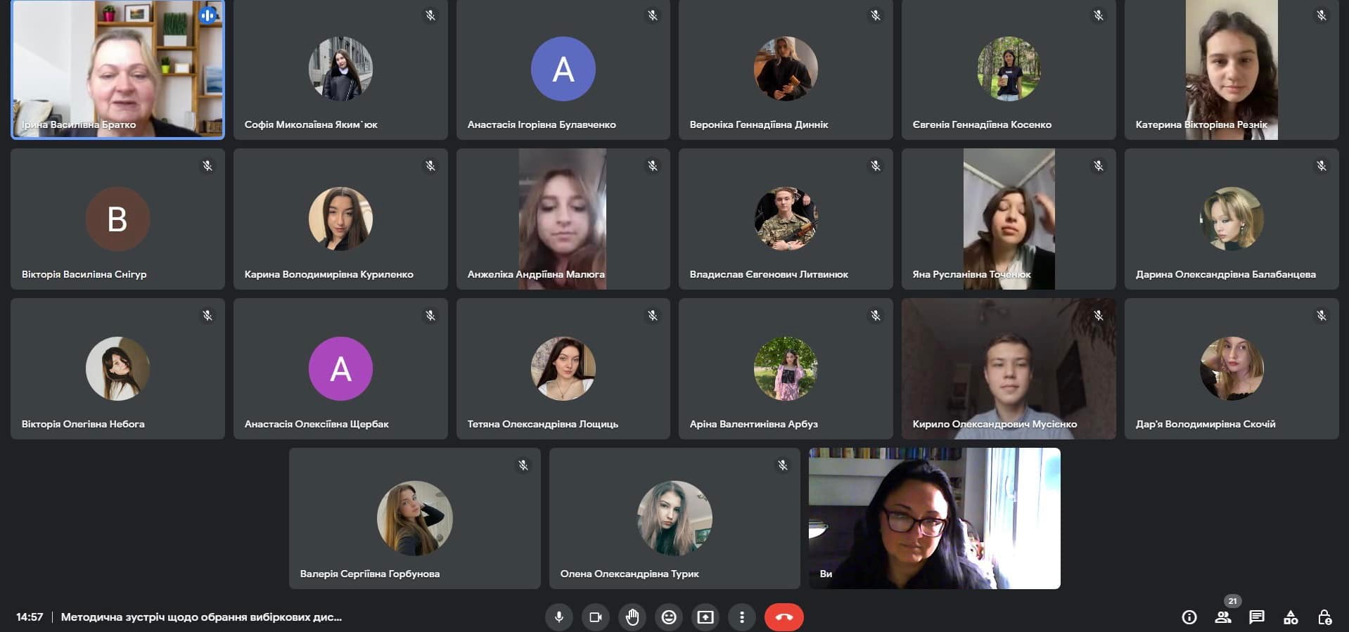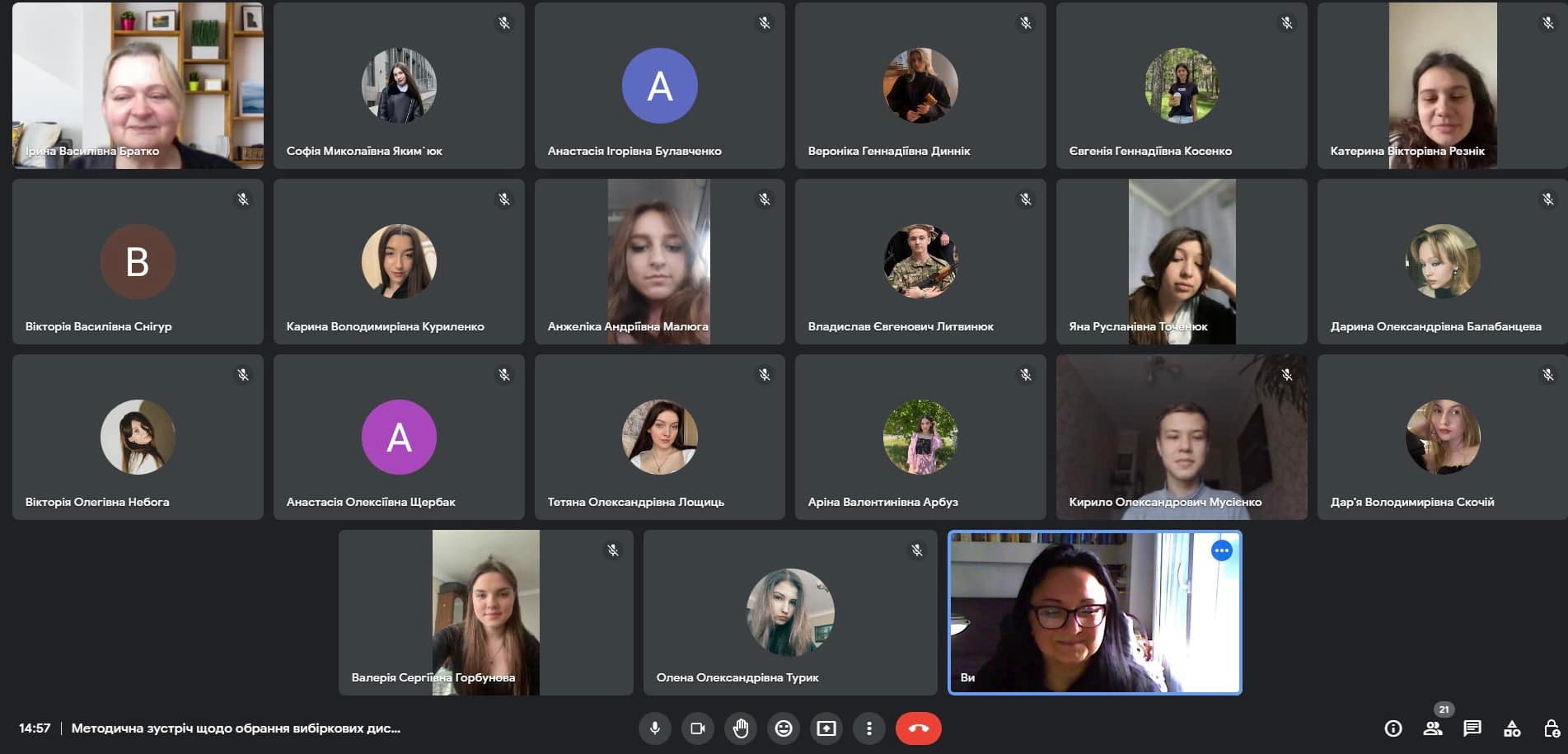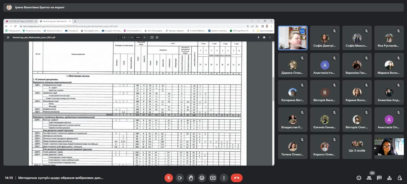 31 березня 2023 року відбулася методична зустріч завідуючої кафедрою Ірини Братко та куратора академічної групи доцента кафедри Інни Ворошилової зі студентами 1 курсу спеціальності «Міжнародне право» з приводу обрання вибіркових дисциплін. Студенти отримали інформацію про процедуру вибору і обрання дисциплін із каталогу вибіркових дисциплін, рекомендації та консультацію щодо наявних у каталозі дисциплін, зокрема, блоків фахових курсів, що пропонуються кафедрою міжнародного права, європейської та євроатлантичної інтеграції, а також інших курсів, що містяться у каталозі дисциплін, обговорили важливість зваженого вибору та значення дисциплін, що мають бути обрані, для подальшого навчання та поглиблення й розширення відповідних професійних компетентностей майбутніх юристів-міжнародників.