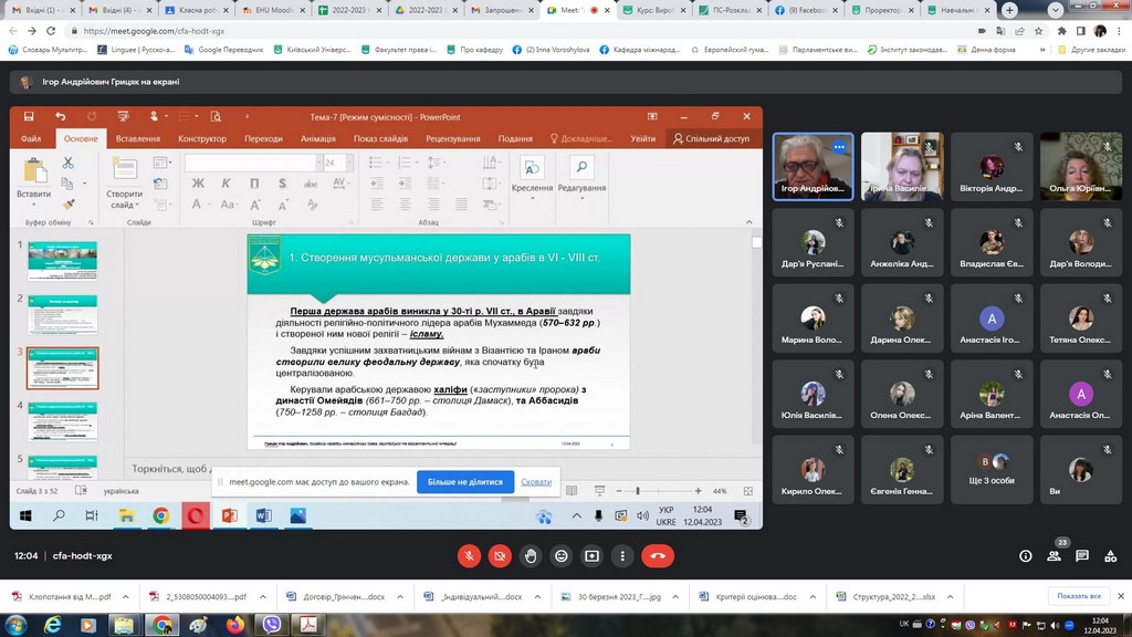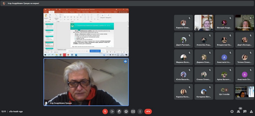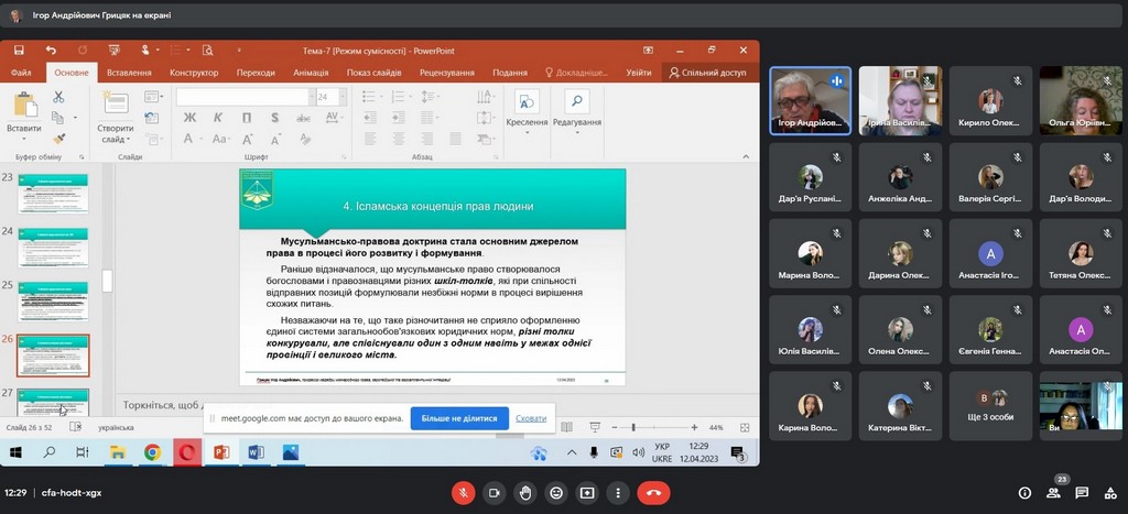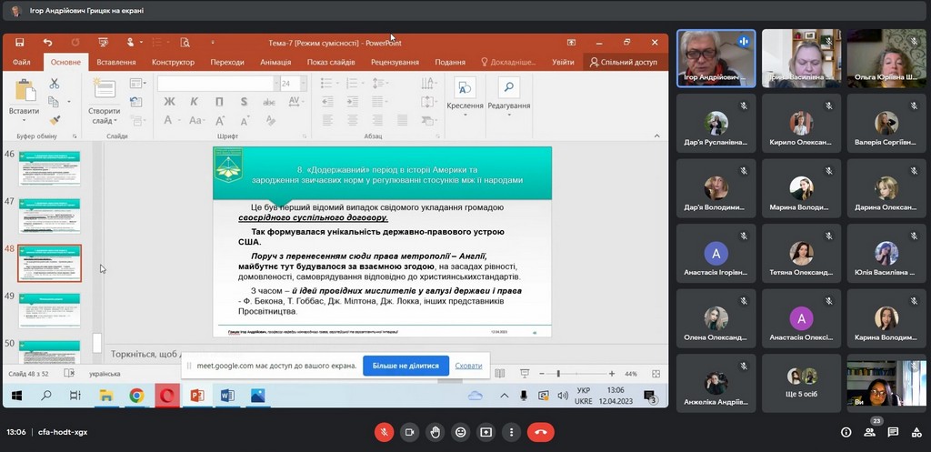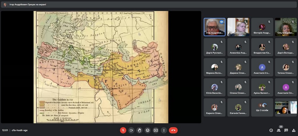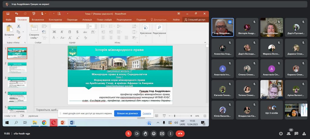 12 квітня 2023 року в рамках конкурсу на заміщення вакантних посад кафедри міжнародного права, європейської та євроатлантичної інтеграції відбулася відкрита (конкурсна) відеолекція професора кафедри міжнародного права, європейської та євроатлантичної інтеграції, кандидата юридичних наук, доктора наук з державного управління, професора, заслуженого діяча науки і техніки України Ігоря Андрійовича Грицяка для студентів І курсу спеціальності «Міжнародне право» (групи МПб-1-22-4.0д) з навчальної дисципліни «Історія міжнародного права» на тему «Формування норм міжнародного права на Арабському Сході, в країнах Африки та Америки» (змістовий модуль 2. «Міжнародне право в епоху Середньовіччя»). Лекція відбулася за навчальним розкладом академічної групи.