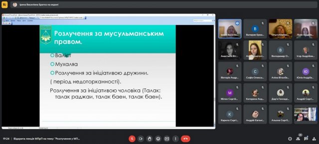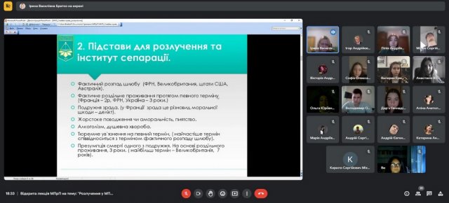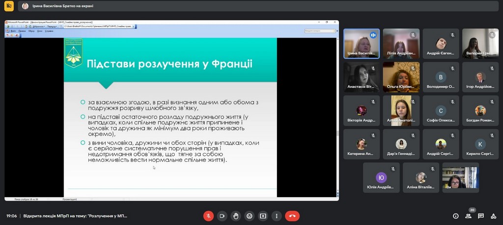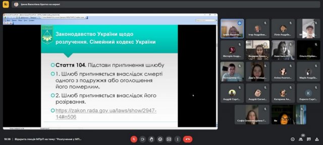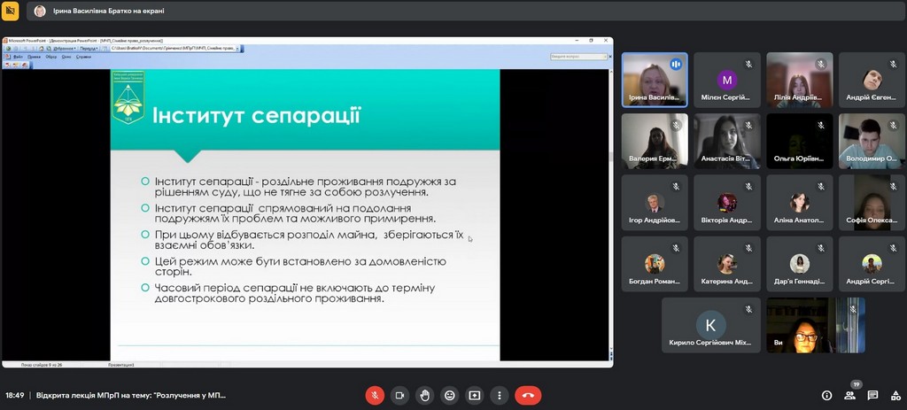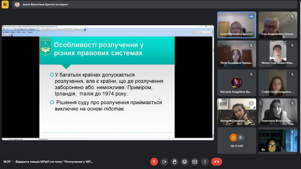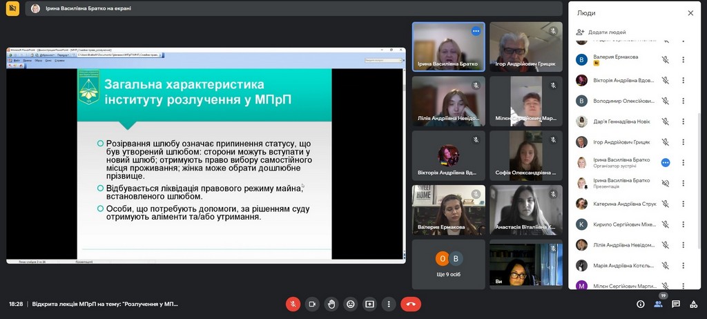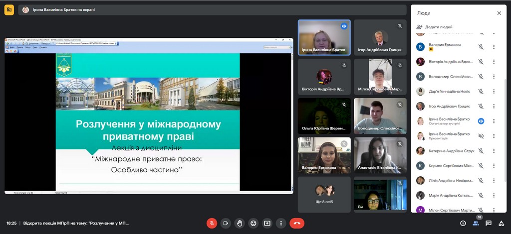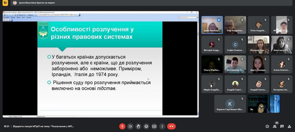 12 квітня 2023 року в рамках конкурсу на заміщення вакантних посад кафедри міжнародного права, європейської та євроатлантичної інтеграції відбулася відкрита (конкурсна) відеолекція завідуючої кафедрою міжнародного права, європейської та євроатлантичної інтеграції, кандидата юридичних наук, доцента Ірини Василівни Братко для студентів ІІІ курсу спеціальності «Міжнародне право» (групи МПб-1-20-4.0д) з навчальної дисципліни «Міжнародне приватне право: Особлива частина» на тему «Розлучення у міжнародному приватному праві». Лекція відбулася за навчальним розкладом академічної групи.