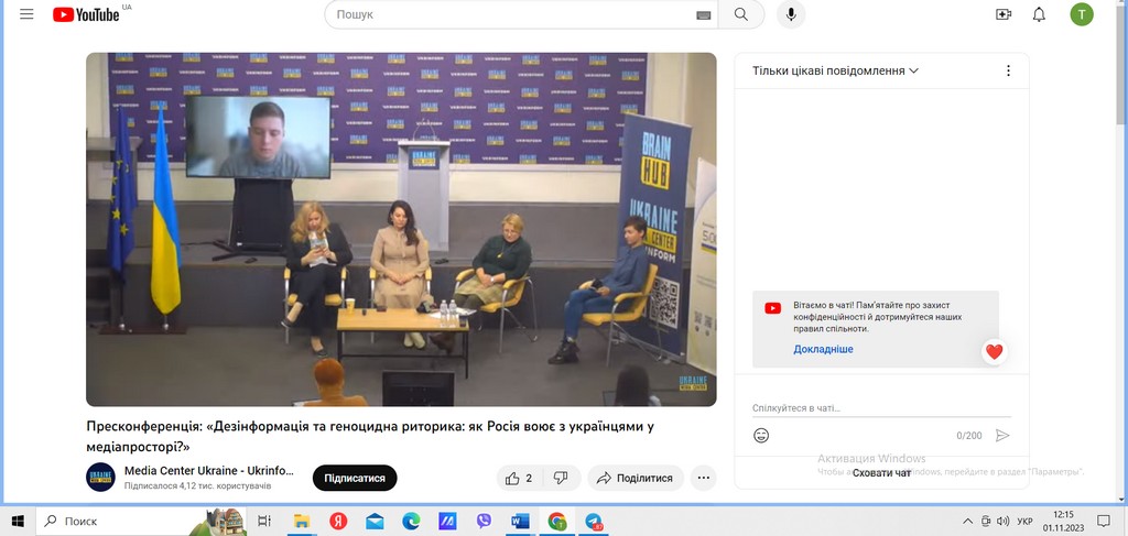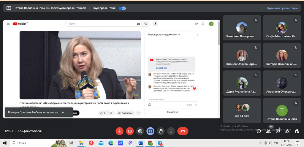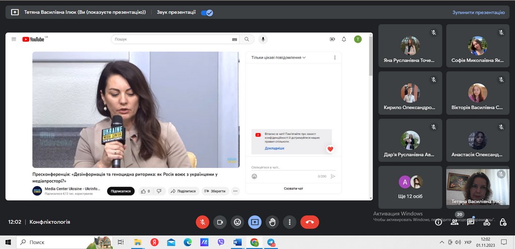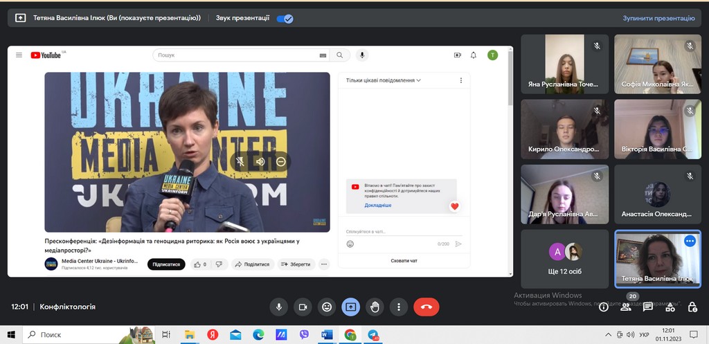 1 листопада 2023 року студенти 2-го курсу освітньої програми «Міжнародне право» долучилися до прес-конференції на тему “Дезінформація та геноцидна риторика: як Росія воює з українцями у медіапросторі?”, організованої Коаліцією “Україна. П’ята ранку” у партнерстві із Міністерством закордонних справ Нідерландів. Студенти відвідали захід в межах реалізації концепції практикоорієнтованого навчання, як практичне заняття із дисципліни «Конфліктологія» (викладач – доцент кафедри міжнародних відносин, кандидат історичних наук Тетяна Василівна Ілюк) в рамках діяльності Інформаційно-аналітичного центру компетентностей Факультету права та міжнародних відносин.