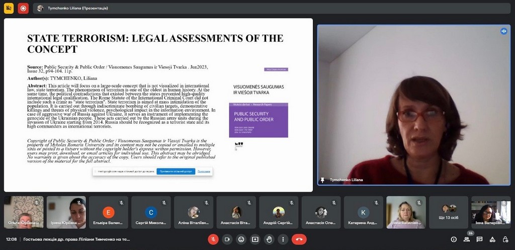 5 грудня 2023 року в онлайн-форматі відбулася гостьова лекція доцента Академічного департаменту соціальних наук Європейського гуманітарного університету (м. Вільнюс, Литва), кандидата юридичних наук Ліліани Тимченко на тему «Державний тероризм: тактика і стратегія РФ в агресивній війні проти України».