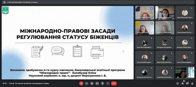 У роботі Секції 7 "Актуальні проблеми міжнародного права" взяли участь студенти-бакалавранти ОП "Міжнародне право". Теми їх виступів стосувалися, зокрема, військових та гуманітарних аспектів захисту прав людини, міжнародно-правового врегулювання діяльності військових журналістів, проблем захисту прав тварин, окремих аспектів міжнародного медичного права, реалізації принципу територіальної цілісності у міжнародному праві, тощо. Модератором секції виступила доцент кафедри Ольга Шереметьєва.