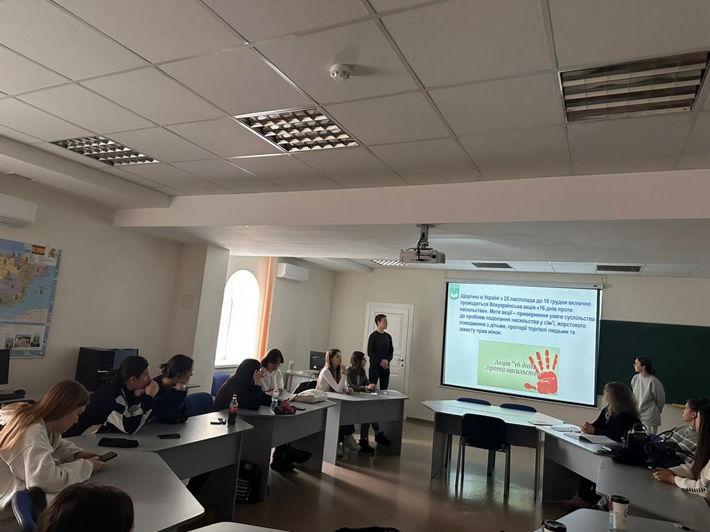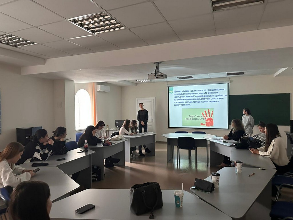 23 листопада 2023 року в рамках Всеукраїнської акції «16 днів проти насильства» доцент кафедри, кандидат юридичних наук Ольга Шереметьєва разом зі студентами 2 року навчання спеціальності «Міжнародне право» провела захід, присвячений проблемам протидії насильству та боротьби з ним. Оскільки ГА ООН оголосила 25 листопада Міжнародним днем боротьби за ліквідацію насильства щодо жінок, щороку напередодні цього дня у різних країнах по всьому світу розпочинається акція «16 днів проти насильства».