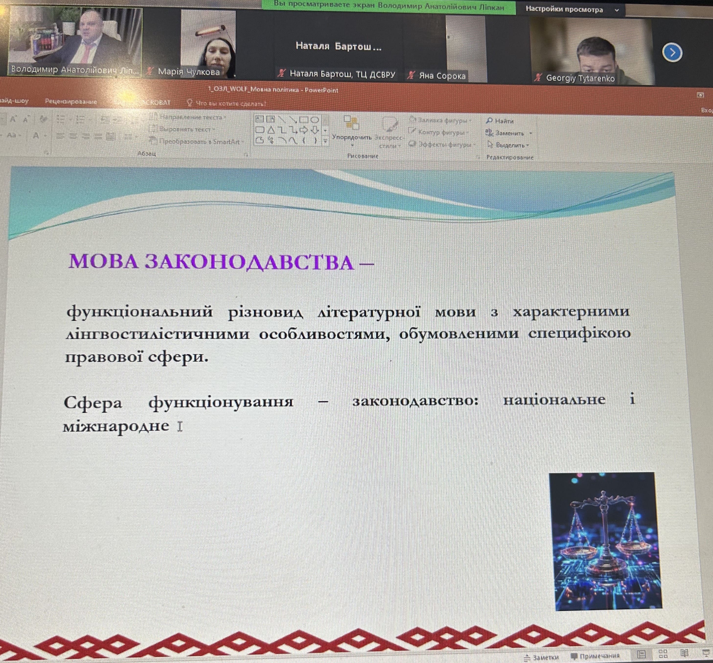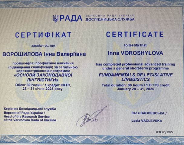 У період з 28 по 31 січня 2025 року доцент кафедри, кандидат юридичних наук, старший науковий співробітник Інна Ворошилова пройшла інтенсивний фаховий курс підвищення кваліфікації за загальною короткостроковою програмою «Основи законодавчої лінгвістики». Навчання було організовано на базі Тренінгового центру Дослідницької служби Верховної Ради України та включало лекції й практичні заняття. Тренером курсу виступив доктор юридичних наук, професор Володимир Ліпкан.