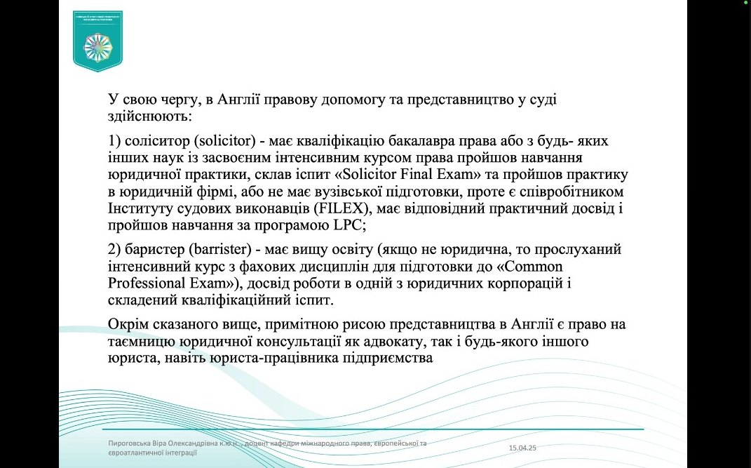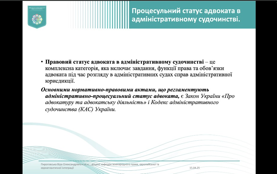 Віра Пироговська провела лекцію на тему «Участь адвоката в адміністративному процесі» для студентів 4 курсу спеціальності «Міжнародне право» (група МПб-1-21-4.0д) в рамках дисципліни «Адвокатура».