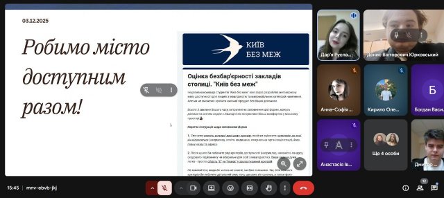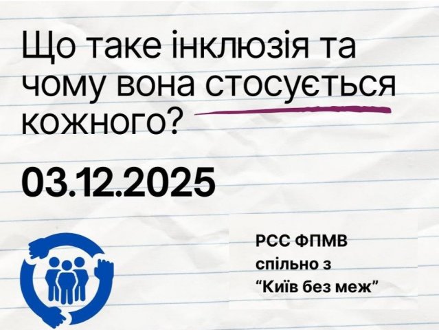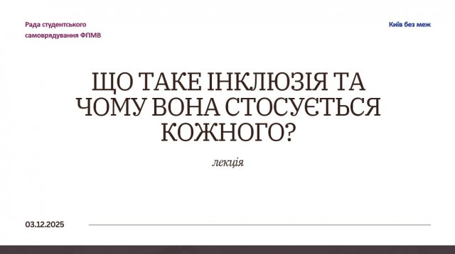 03 грудня 2025 року команда соціального проєкту «Київ без меж», що реалізовується під керівництвом кафедри міжнародного права, європейської та євроатлантичної інтеграції Факультету права та міжнародних відносин, спільно з Радою студентського самоврядування ФПМВ провела студентську лекцію «Що таке інклюзія та чому вона стосується кожного?». Захід було присвячено Міжнародному дню людей з інвалідністю. Його учасниками стали студенти ФПМВ різних спеціальностей та років навчання.