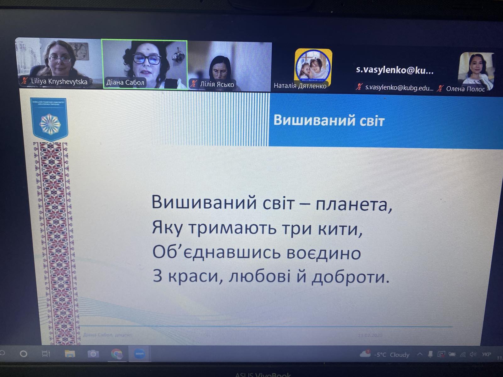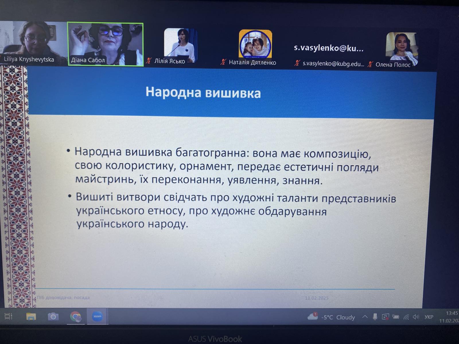 - 02.2025 Лекція "Народна вишивка в традиційній культурі українців" (модератор: Діана Сабол; викладачі: Заверуха Юлія Григорівна, Книшевицька Лілія Володимирівна) розкрила символіку та історичні аспекти української вишивки.