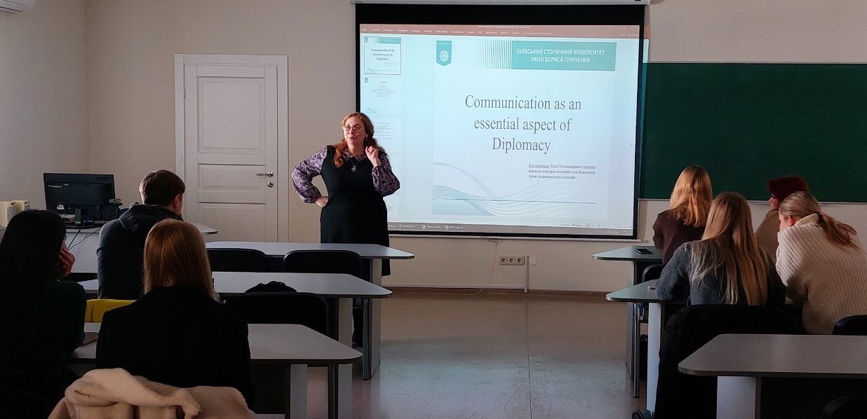 Заняття старшого викладача Книшевицької Л.В. на тему «Communication as an essential aspect of diplomacy» в модулі «Trends of the modern world» вирізнялося чіткою продуманою структурою та відповідала сучасним освітнім вимогам: вступна частина, актуалізація знань, основна частина з теоретичним і практичним наповненням, а також підсумкове обговорення. Зміст заняття охоплював як письмові, так і усні форми дипломатичного спілкування, включаючи особливості дипломатичної кореспонденції, риторичні прийоми, а також елементи міжкультурної комунікації. Особливу увагу заслуговує добір автентичних матеріалів, що сприяли формуванню професійної компетентності студентів. Інтерактивні завдання, зокрема вправи на заповнення пропусків, обговорення ситуацій, рольові ігри та написання мотиваційних промов, забезпечили високий рівень залученості студентів і практичне спрямування заняття. Аналіз стилістичних прийомів та засобів, які використовували промовці з відео, дозволили Книшевицькій Л.В. доступно пояснювати студентам на реальних прикладах правила грамотної і ефективної дипломатичної комунікації, для цього студенти вправлялись також в аналізі вдалих та невдалих прикладів письмової дипломатичної комунікації.