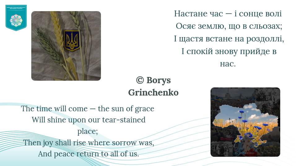 Студенти 1 курсу спеціальності «Міжнародне право» факультету права та міжнародних відносин, у контексті формування своєї майбутньої професійної компетентності, проаналізували творчість Бориса Грінченка та, переклавши його патріотичні вірші англійською мовою, провели паралелі між літературною спадщиною автора, історичними подіями та сучасними реаліями в Україні.