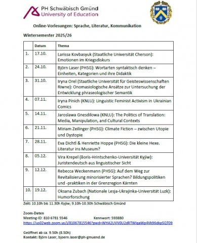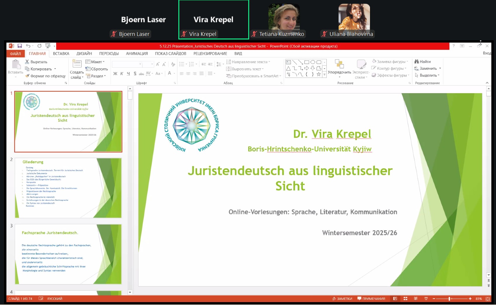 05 грудня 2025 року завідувач кафедри іноземних мов Факультету права та міжнародних відносин, кандидат філологічних наук, доцент Віра Крепель в рамках участі у міжнародному освітньо-науковому проєкті, організованому Педагогічним інститутом Швебіш Гмюнд (Німеччина) на базі Київського національного лінгвістичного університету виступила з науковою доповіддю на тему «Німецька юридична мова з точки зору лінгвістики». Німецько-український освітньо-науковий проєкт започатковано у 2022 році, він має на меті підвищення кваліфікації германістів України, учасниками семінару є викладачі німецької, а з весни 2024 року також і англійської мови. Тематика семінарів у форматі онлайн охоплює актуальні питання лінгвістики, дидактики, німецької літератури, прагматики, комунікативної лінгвістики, фахових мов, воєнного дискурсу, компаративістики, культурології, когнітивної лінгвістики та фразеології.