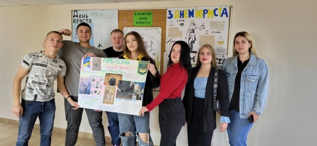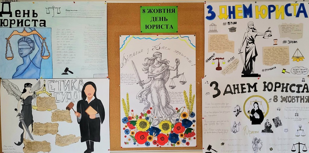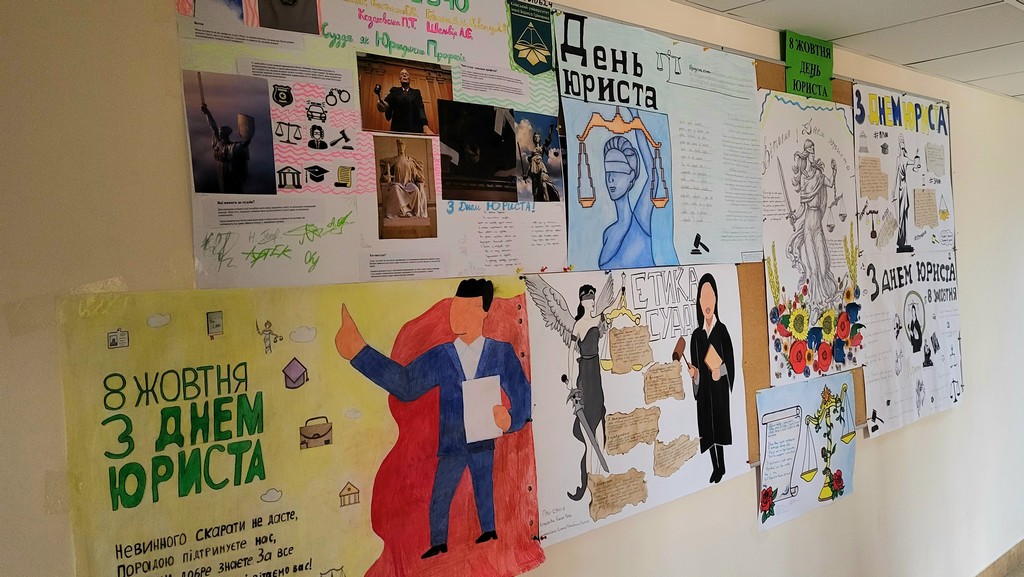 До Дня юриста студенти 1 курсу спеціальності «Право» Факультету права та міжнародних відносин (групи ПРб-1-23-4.0д та ПРб-2-23-4.0д) під керівництвом старшого викладача кафедри публічного права Обловацької Н.О. підготували виставку тематичних творчих робіт.