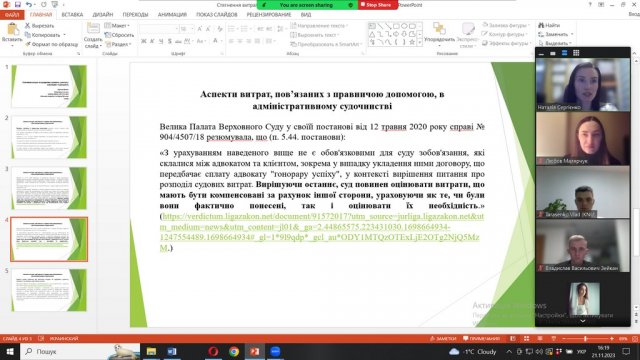 21.11.2023 доктор юридичних наук, професор кафедри публічного права Сергієнко Наталія Артурівна взяла участь в роботі гуртка «Виконавче провадження та адвокатура» Київського національного університету імені Тараса Шевченка. В роботі гуртка взяли участь студенти-юристи Київського національного університету імені Тараса Шевченка, доценти Кафедри нотаріального, виконавчого процесу та адвокатури, прокуратури, судоустрою Київського національного університету імені Тараса Шевченка – д.ю.н. Бондар І.В., к.ю.н. Снідевич О. С., к.ю.н. Малярчук Л. С. Темою обговорення були найбільш гострі питання стягнення втрат на професійну правничу допомогу. З доповідями виступили студенти-правники; д.ю.н. Сергієнко Н.А. виступила з доповіддю, де висвітила теорію та практику стягнення витрат на професійну правничу допомогу, проілюструвавши свої доводи актуальною судовою практикою та власним адвокатським досвідом, відповіла на питання присутніх на гуртку щодо обговорюваної теми.