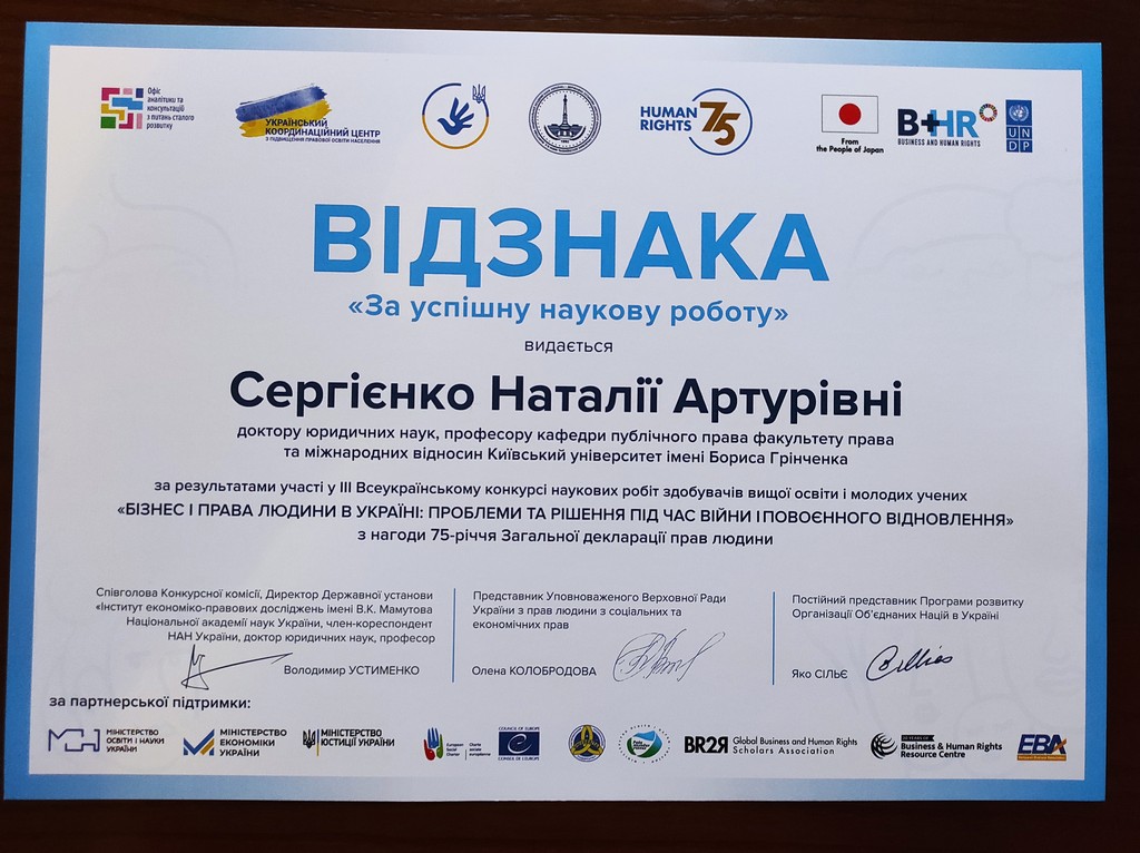 Професор кафедри публічного права Факультету права та міжнародних відносин, доктор юридичних наук Сергієнко Наталія Артурівна отримала Відзнаку «За успішну наукову роботу» у ІІІ-му Всеукраїнському конкурсі наукових робіт здобувачів вищої освіти та молодих учених "Бізнес і права людини в Україні: проблеми та рішення під час війни та повоєнного відновлення" з нагоди 75-річчя Загальної декларації прав людини.