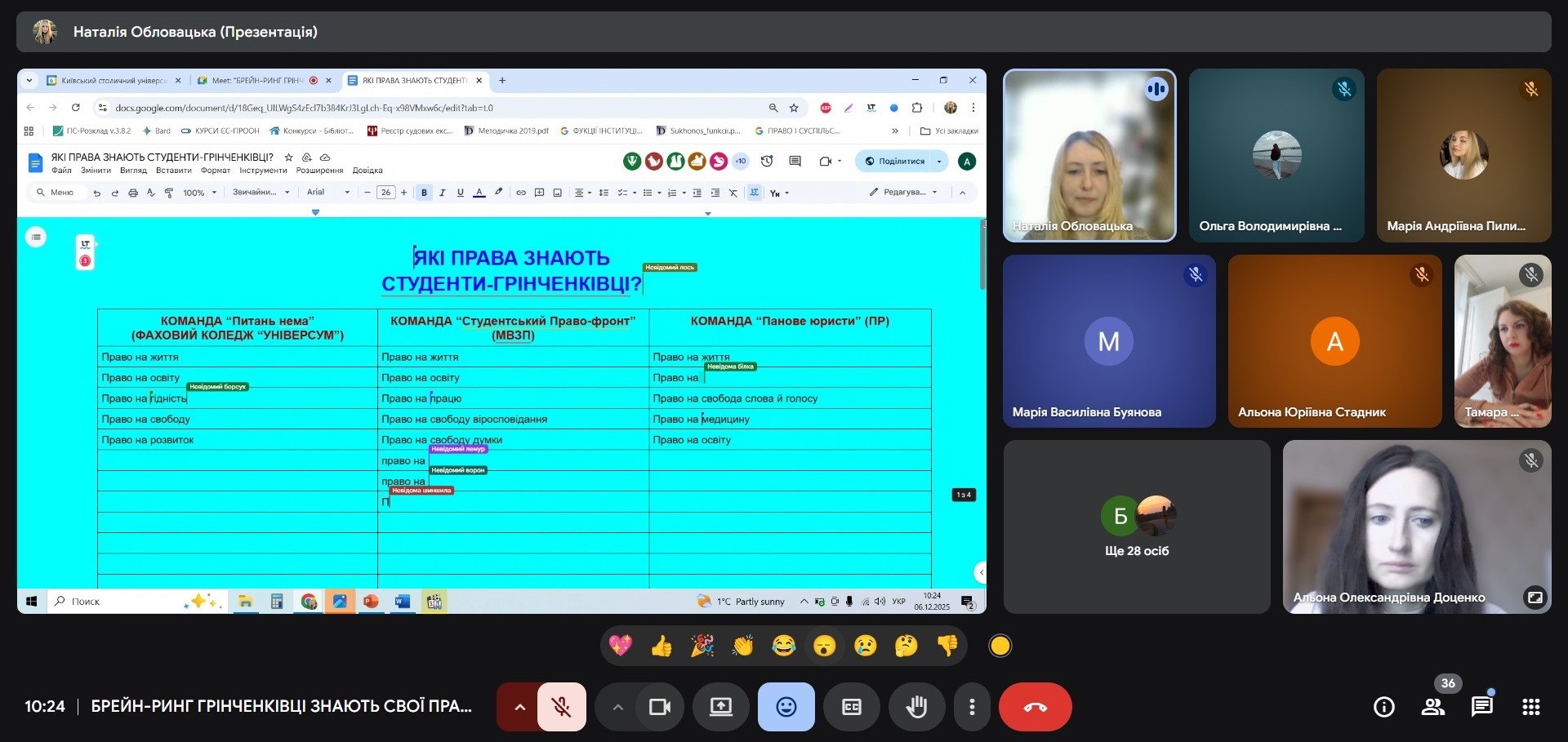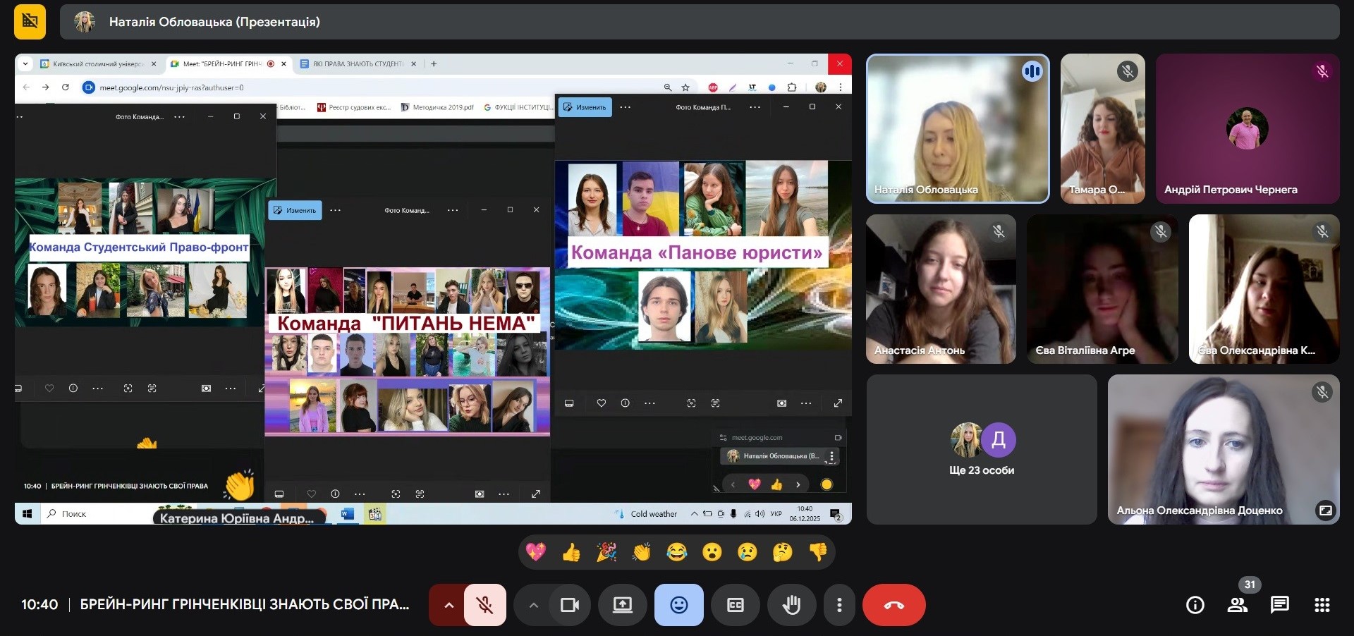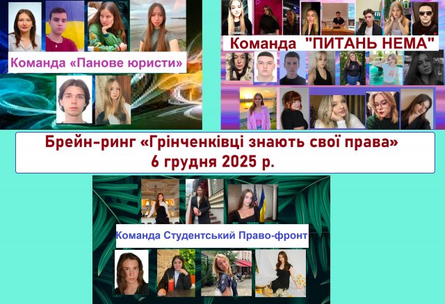 06 грудня 2025 року кафедра публічного права провела онлайн-захід, що став однією з яскравих подій Грінченківської декади – Брейн-ринг «Грінченківці знають свої права». У професійному змаганні зійшлися студенти спеціальностей «Право» та «Міжнародні відносини» Факультету права та міжнародних відносин разом із студентами Фахового коледжу «Універсум».