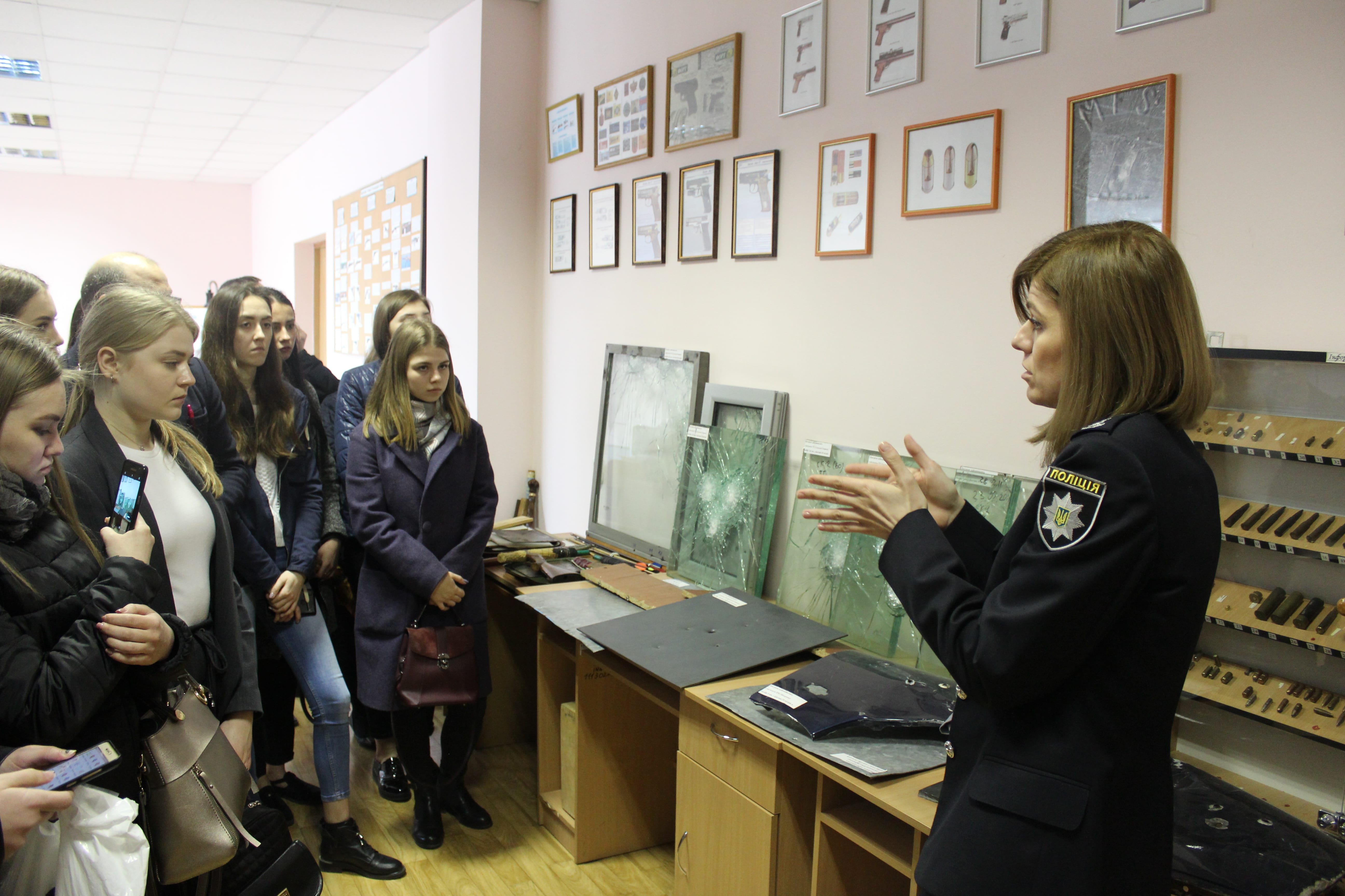 Студенти ознайомилися із навчальним процесом курсантів, відвідали аудиторії та профільні кафедри – криміналістичного забезпечення та судових експертиз, вогневої та спеціальної фізичної підготовки, поспілкувалися з практичними працівниками, які розповіли про особливості практичної підготовки майбутніх поліцейських-криміналістів та експертів. Особливі враження у студентів залишилися після відвідання комплексу з вогневої підготовки – тиру та спеціально обладнаних для занять кімнат, де вони мали можливість ознайомитися із різними видами табельної вогнепальної зброї працівників поліції, її тактико-технічними характеристиками, правилами поводження та особливостями використання та застосування її у практичній діяльності. Студенти відчули атмосферу відповідальності та ступінь складності у професії поліцейських, адже застосування зброї завжди тягне за собою серйозні наслідки, як для правопорушника так і для самого правоохоронця.