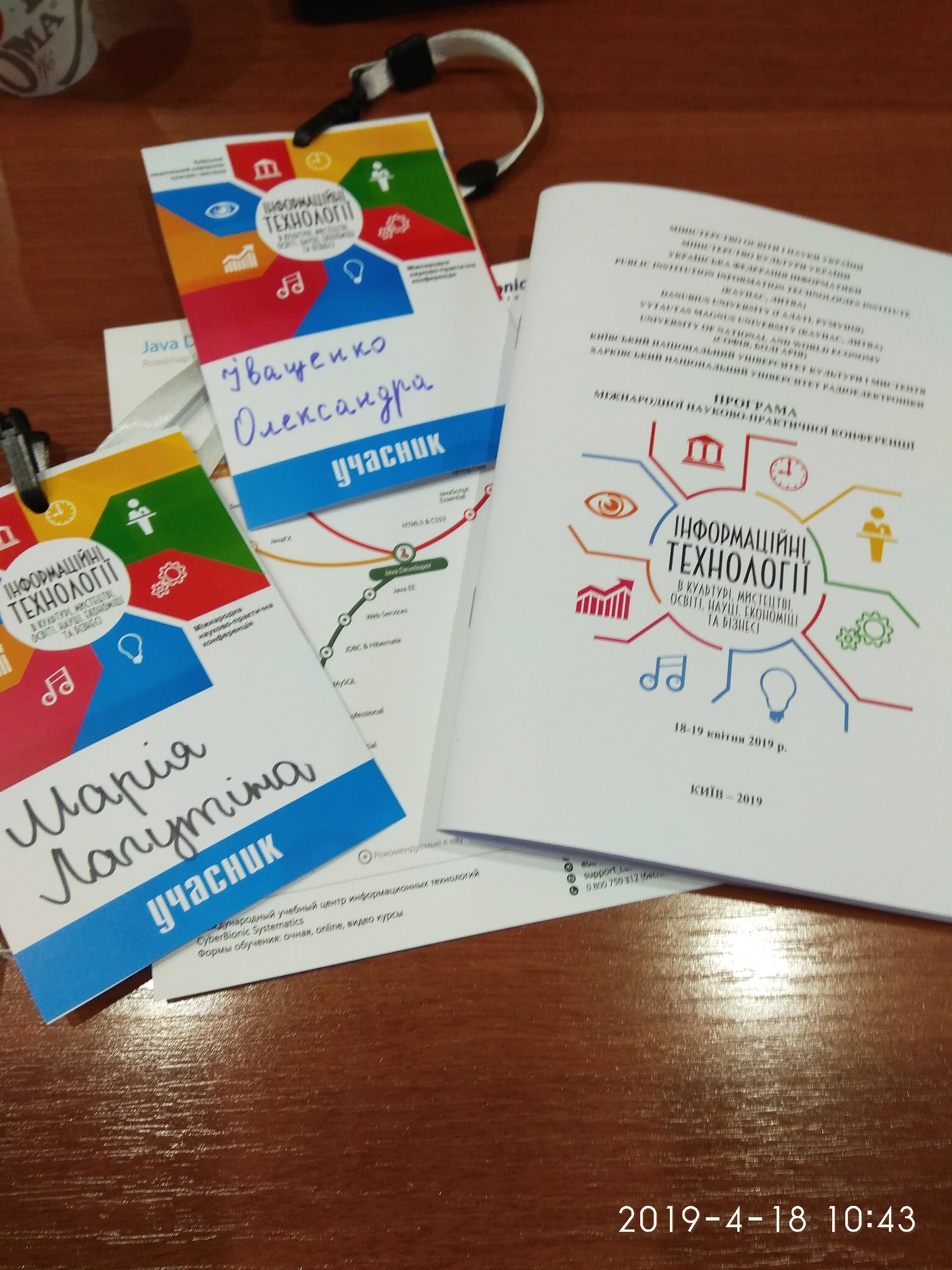 18 квітня студентки ІІ курсу, спеціальності "Регіональні студії " Іващенко Олександра та Лагутіна Марія відвідали Міжнародну науково-практичну конференцію "Інформаційні технології в культурі, мистецтві, освіті, економіці та бізнесі" на базі Київського національного університету культури і мистецтв. Конференція була присвячена використанню інноваційних технологій у сфері освіти та безпеки, а також стратегіям розвитку цифрової економіки.