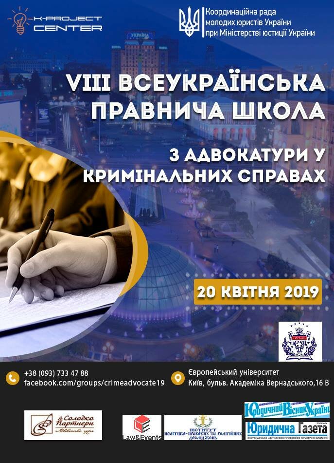 Студенти-консультанти ЮК «Астрея» та Центру юридичної деонтології Факультету права та міжнародних відносин Київського університету імені Бориса Грінченка взяли участь у VIII Всеукраїнській правничій школі з адвокатури у кримінальних справах, організованій Координаційною радою молодих юристів України при Міністерстві юстиції України, Європейським університетом, «K-project center» та за підтримки партнерів заходу: АО «Адвокатської групи «Солодко і партнери», Юридичної газети, Юридичного віснику України, Інституту політико-правових та релігійних досліджень, Law & Events, Всеукраїнської громадської організації «Асоціація правників України».
