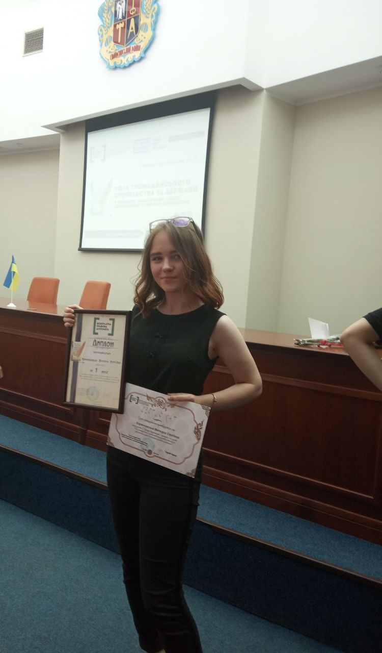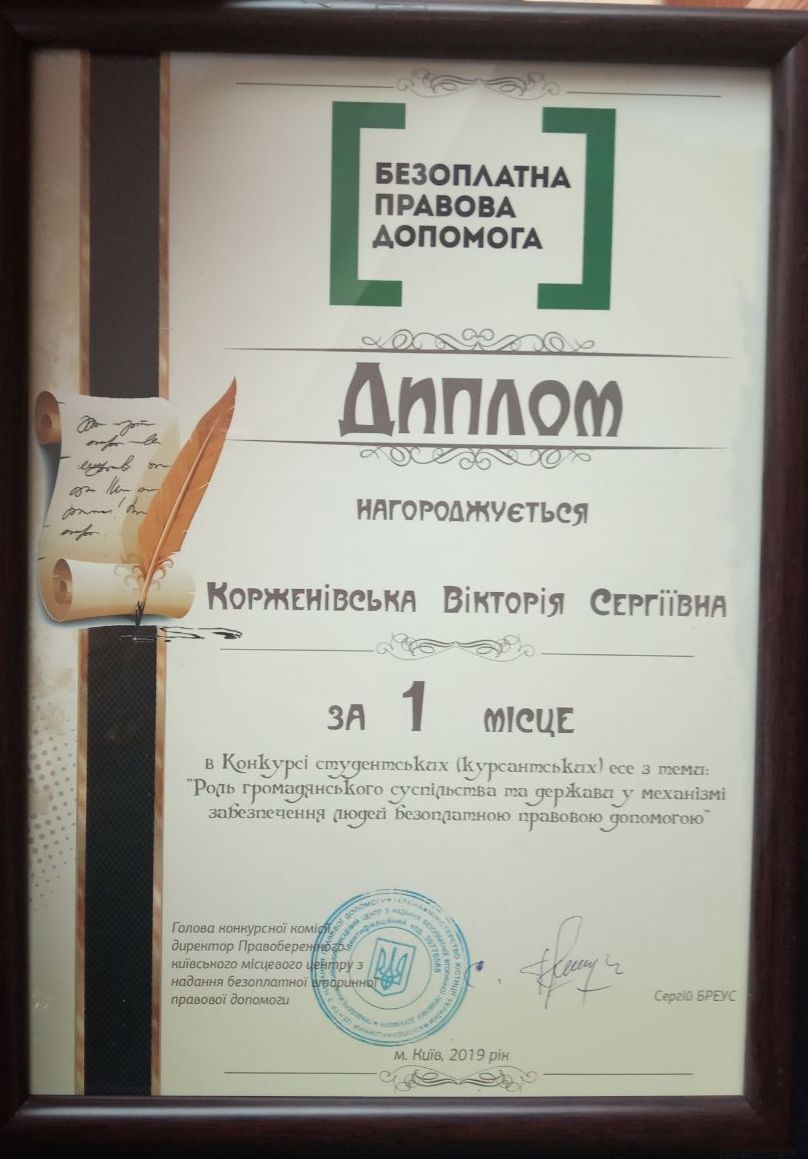 Щиро вітаємо студентку І курсу спеціальності «Регіональні студії» Корженівську Вікторію з перемогою в Конкурсі студентських (курсантських ) есе на тему: «Роль громадського суспільства та держави у механізмі забезпечення людей безоплатною правовою допомогою», який спрямований на підвищення правової свідомості, культури та освіченості студентів та курсантів вищих навчальних закладів м. Києва.