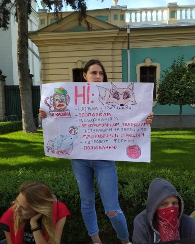 «Хутро це жлобство!», «Захист слабких справа сильних», «Дельфінарій хлорована в’язниця», «Україна – гуманна країна», «Хто як не ми?! Коли як не зараз?!», «Тварини НЕ їжа», «Тварини НЕ одяг», «Тварини НЕ розвага», «GOvegan» та інші.