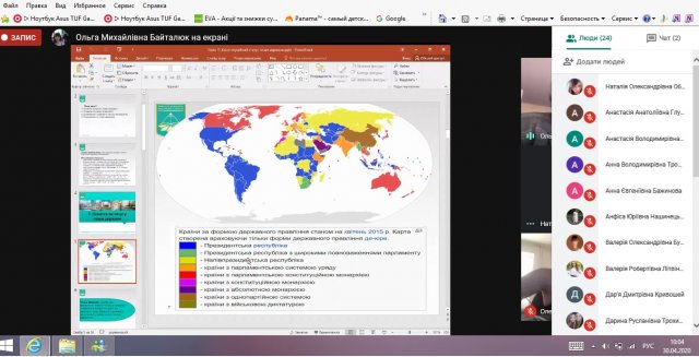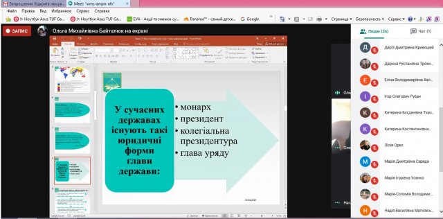 30 квітня 2020 відбулась відкрита відеолекція старшого викладача кафедри публічного та приватного прав Байталюк О.М. з навчальної дисципліни Порівняльне конституційне право для групи МПб-1-19-4.0д (спеціальність «Міжнародне право») на тему: «Конституційний статус глави держави»
