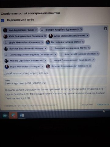 19 травня 2020 р. на кафедрі міжнародних відносин і міжнародного права відбувся захист курсових робіт студентів ІІ курсу спеціальності 293 «Міжнародне право». У комісію по захисту курсових робіт увійшли: декан Факультету права та міжнародних відносин, професор, доктор наук із державного управління Грицяк Ігор Андрійович, доценти кафедри міжнародних відносин і міжнародного права: кандидати юридичних наук: Братко Ірина Василівна, Ворошилова Інна Валеріївна, Тимченко Ліліана Олексіївна, кандидат історичних наук – Вдовиченко Вікторії Андріївни.
