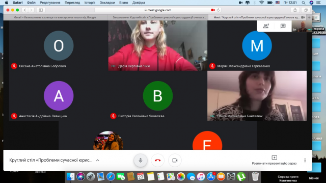 29 травня 2020 року о 12.00 на платформі Google Meet відбувся круглий стіл «Проблеми сучасної юриспруденції очима здобувачів вищої юридичної освіти».
