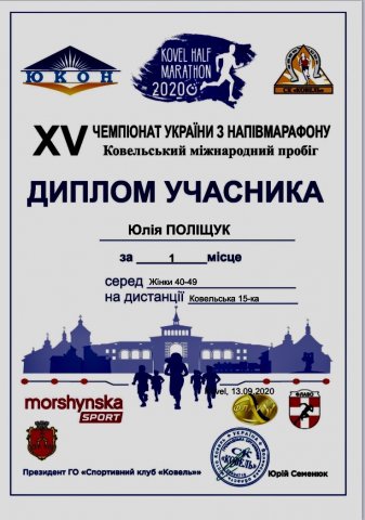 Щиро вітаємо методиста навчального відділу Факультету права та міжнародних відносин Поліщук Юлію Вікторівну з перемогою у XV Чемпіонаті України з напівмарафону (Ковельському Міжнародному пробігу з нагоди 90 -ї річниці першого марафону в Ковелі VIIІ «KOVEL HALFMARATНON-2020») на дистанції 15 км.
